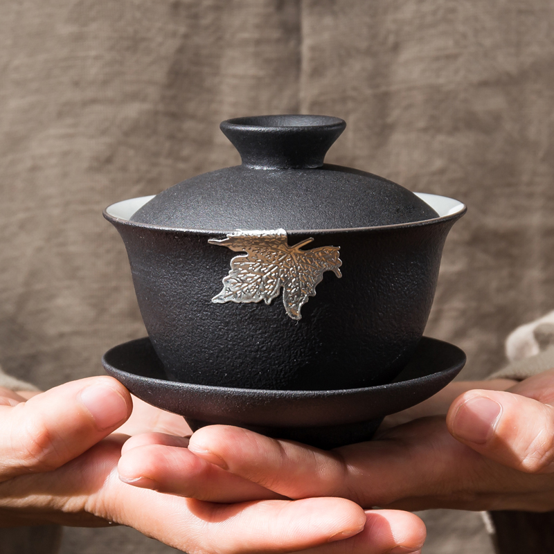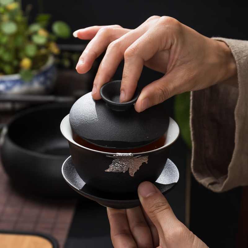 Day Style Retro Zen Manfeng Black Pottery Tea Tea Cover Bowl Three Talents Tea Dao Kung Fu Tea Tea Tea Tea Bowl Coarse Pottery Cover Bowl Tea Cup Home Tea Bowl