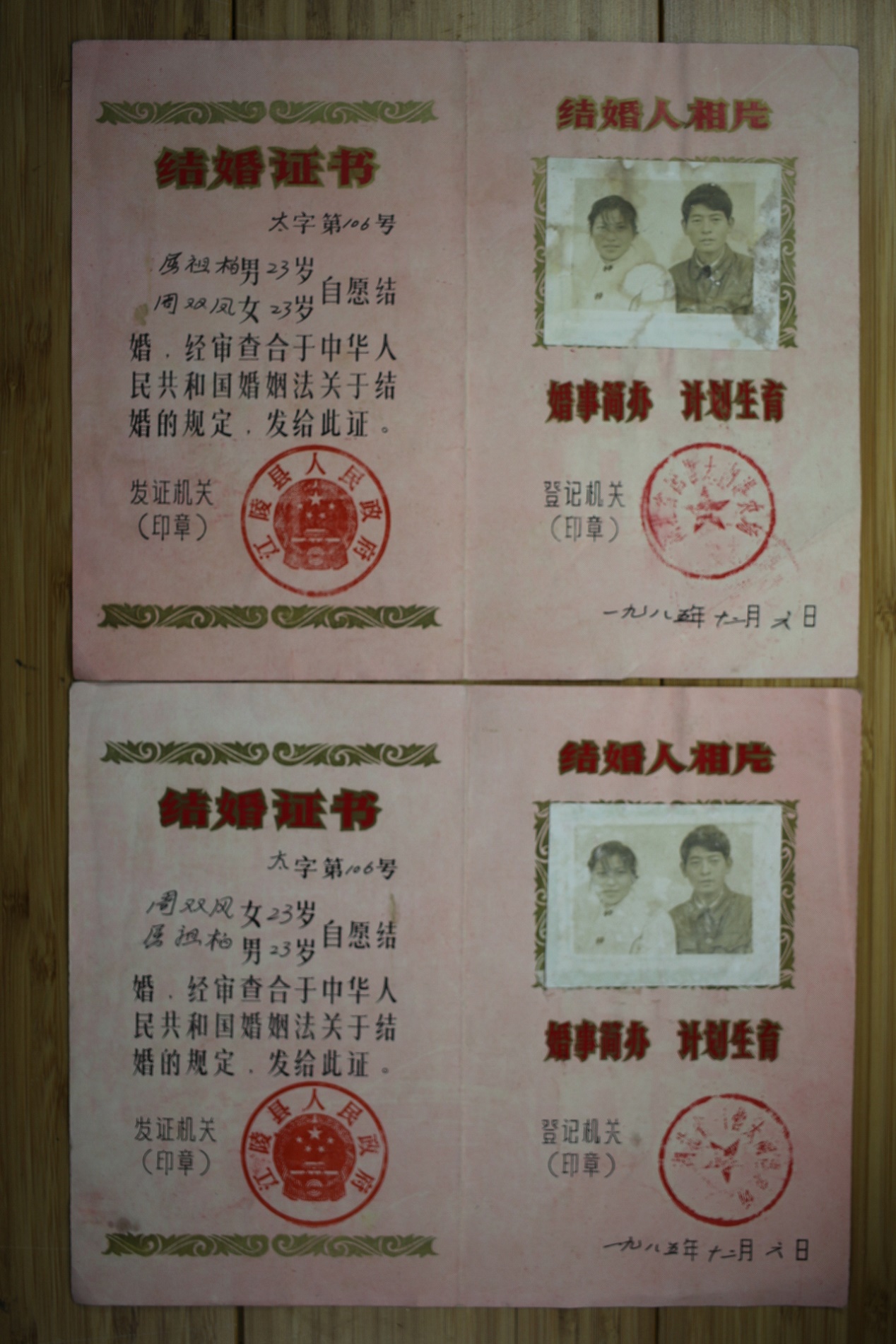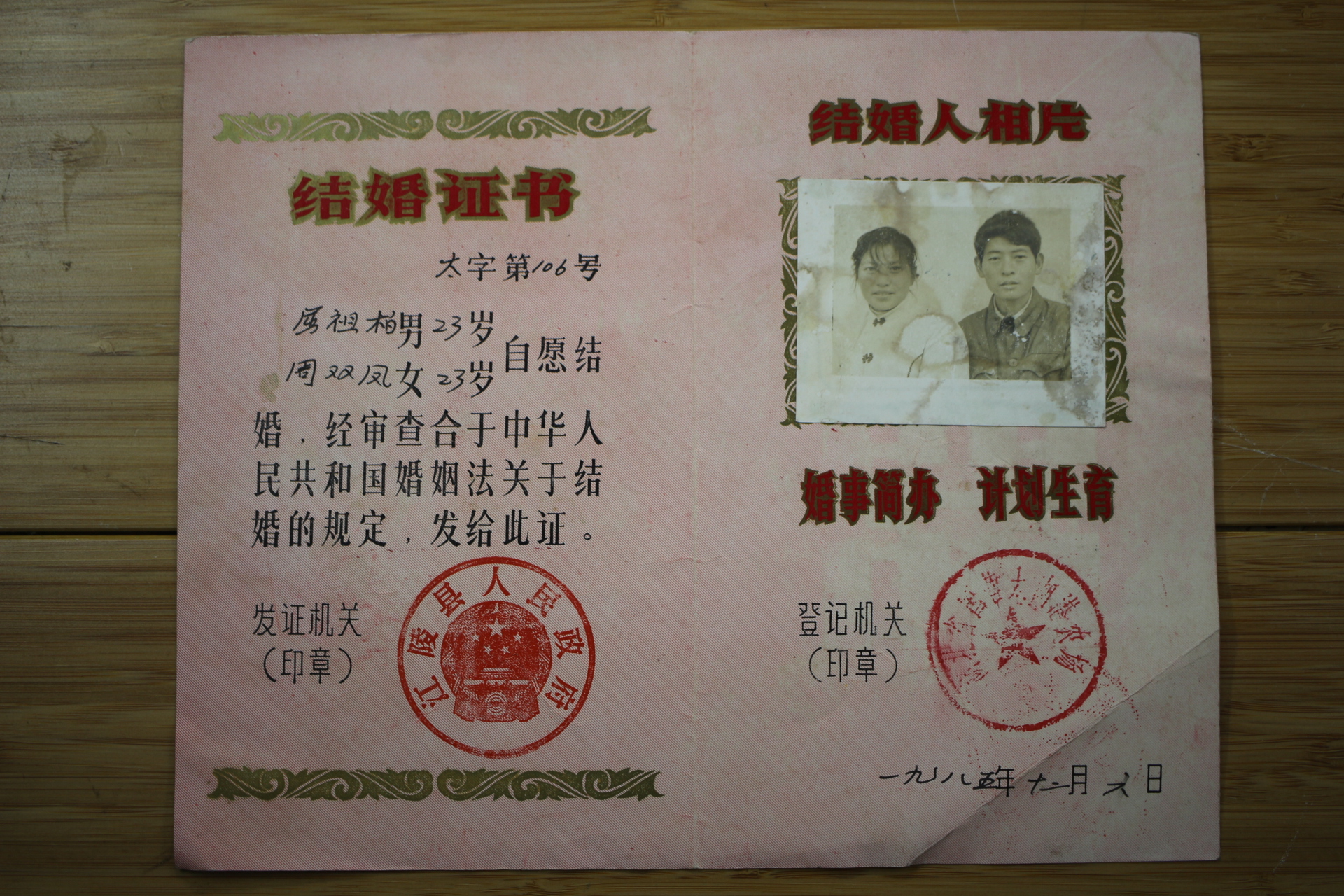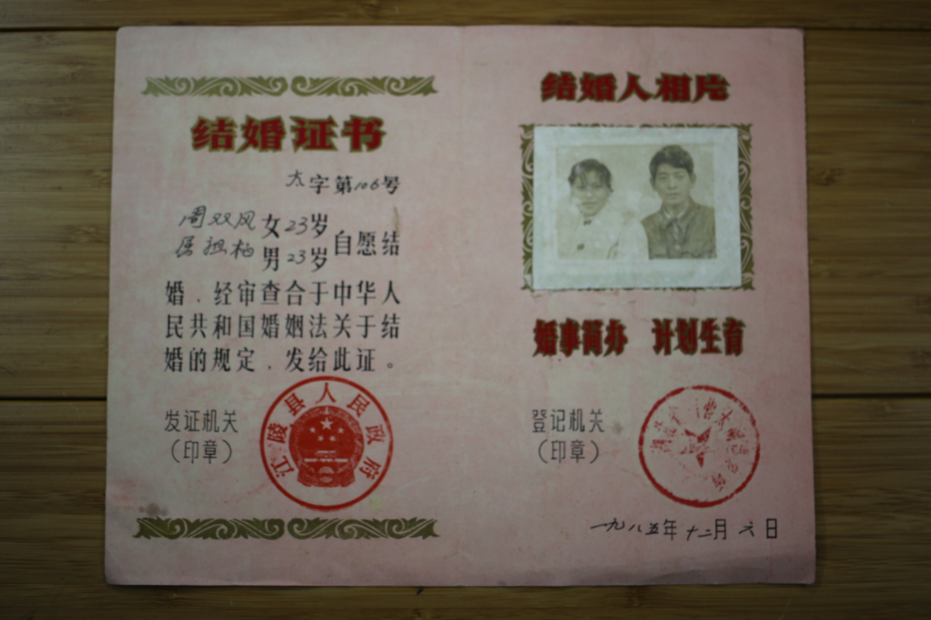 1985 Marriage Certificate Hubei State-owned Taihu Port Farm