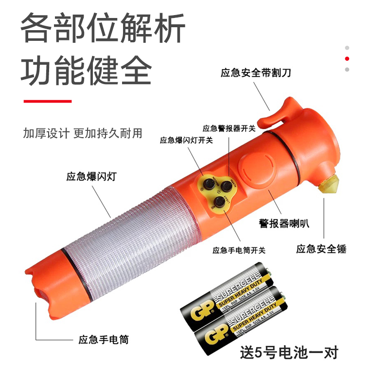 Vehicle safety hammer window breaker vehicle multi-function sound and light alarm fire flashlight 6 in one vehicle escape hammer