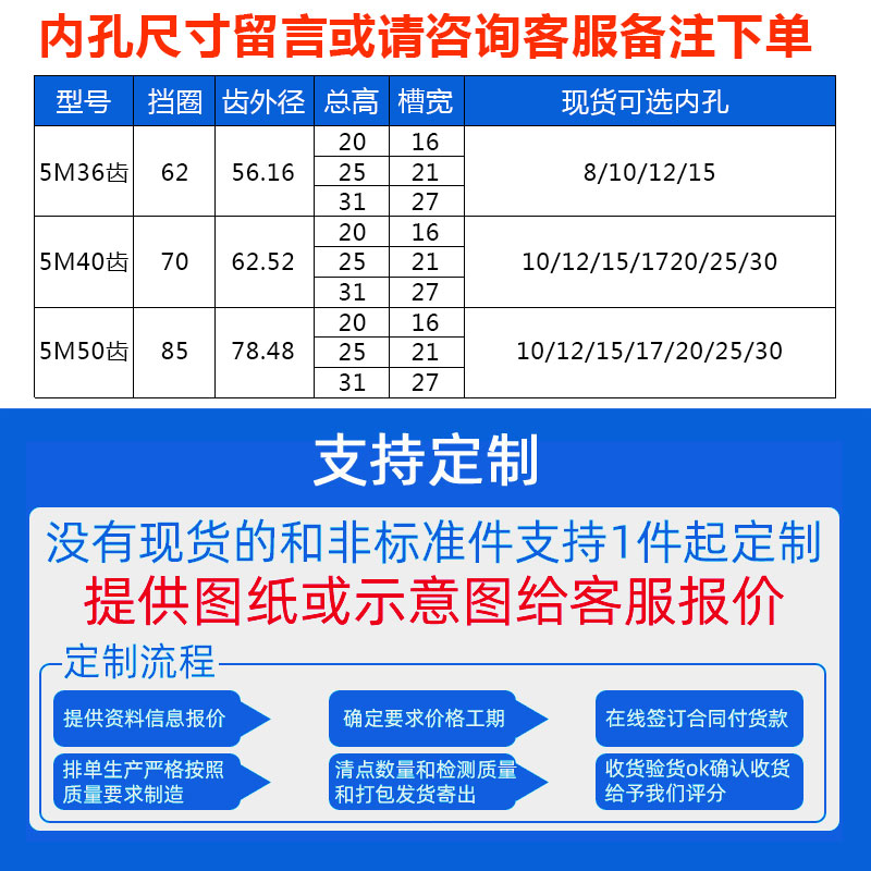 Check in front view details Inner hole Size table Please leave a message with no contact customer service 5M36 teeth (adapted bandwidth 15mm) glossy surface 5M36 teeth (adapted bandwidth 15mm) tooth surface