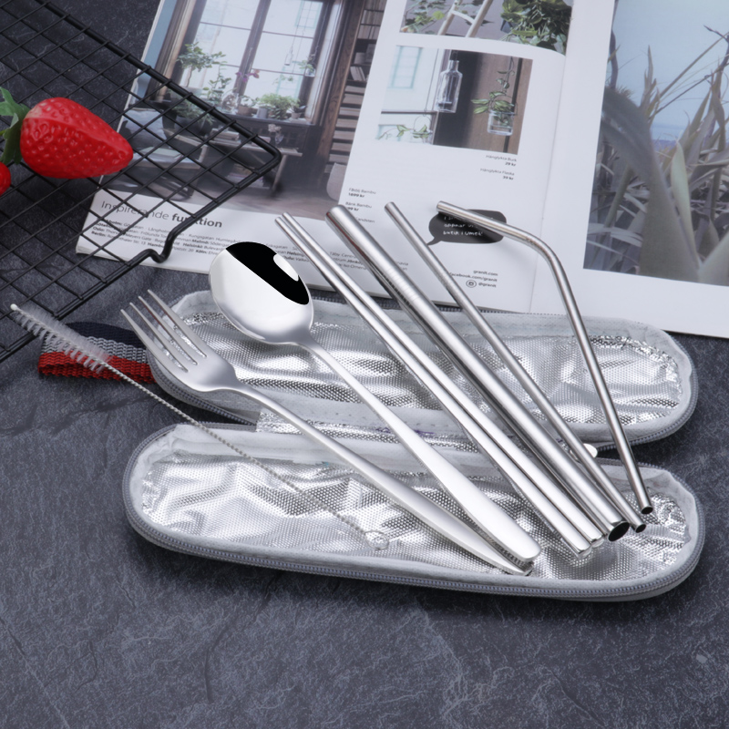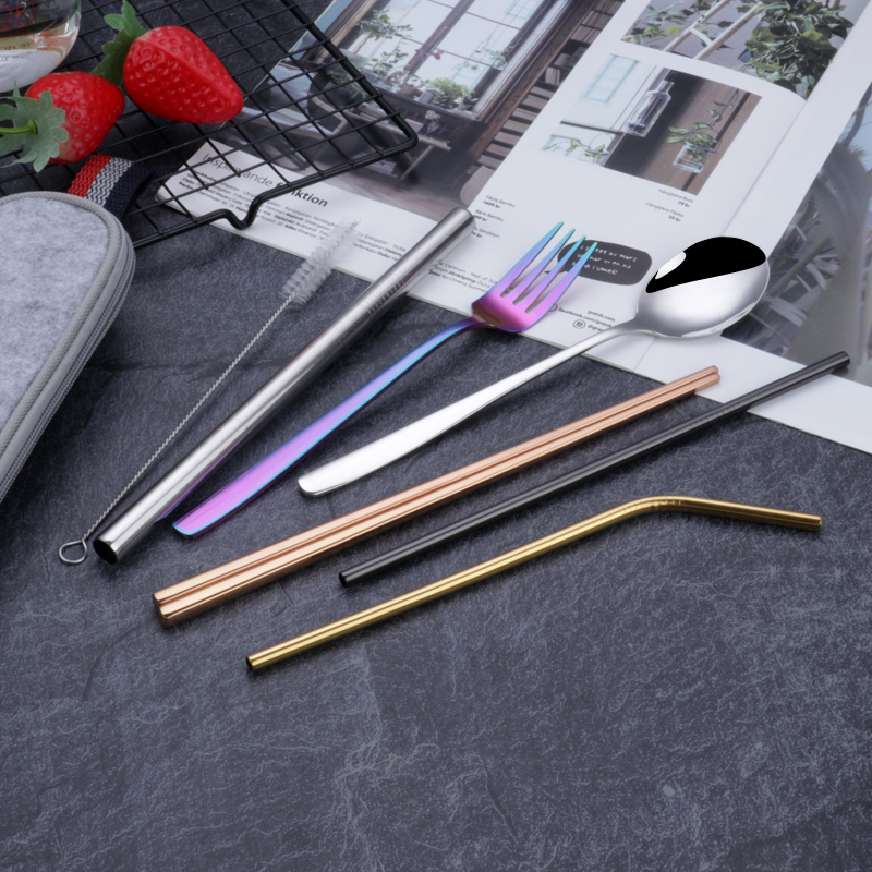 Opening gift customized LOGO environmental protection portable 304 stainless steel spoon fork chopsticks pearl milk tea straw tableware set