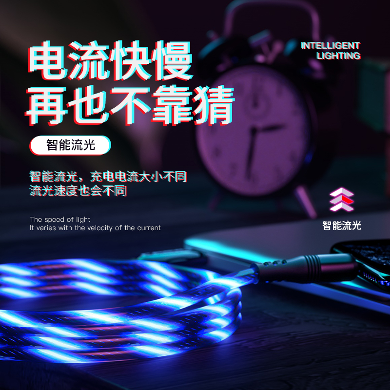 Flow-light data line Apple charging line luminous Android suitable for Huawei type-c mobile phone three-in-one magnetic suction charging line with lamp fast-charging net red race lamp on-board seven colorful luminous trembling