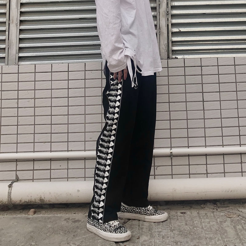 TYST male and female lovers side striped fish bone strings 100 hitch loose sports pants hip hop Hip Hop straight cylinder casual long pants