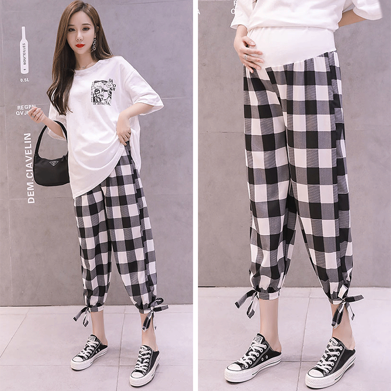 Maternity pants spring and summer outside wear thin fashion hip mom loose cropped small checkered summer lantern pants