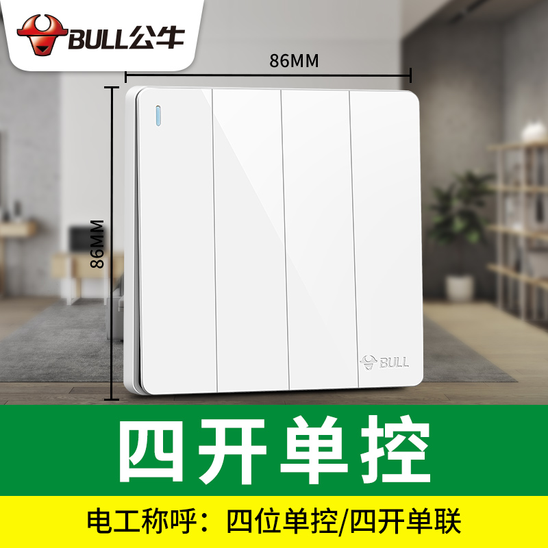 Bull four-on switch Four-position four-joint single control light G12 wall household 86 wall 4-on light switch button