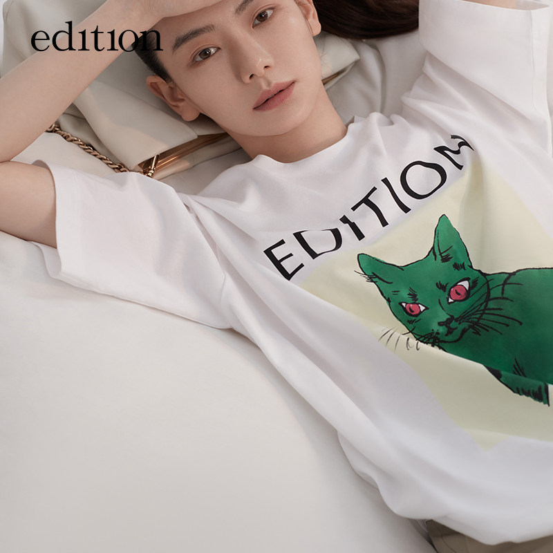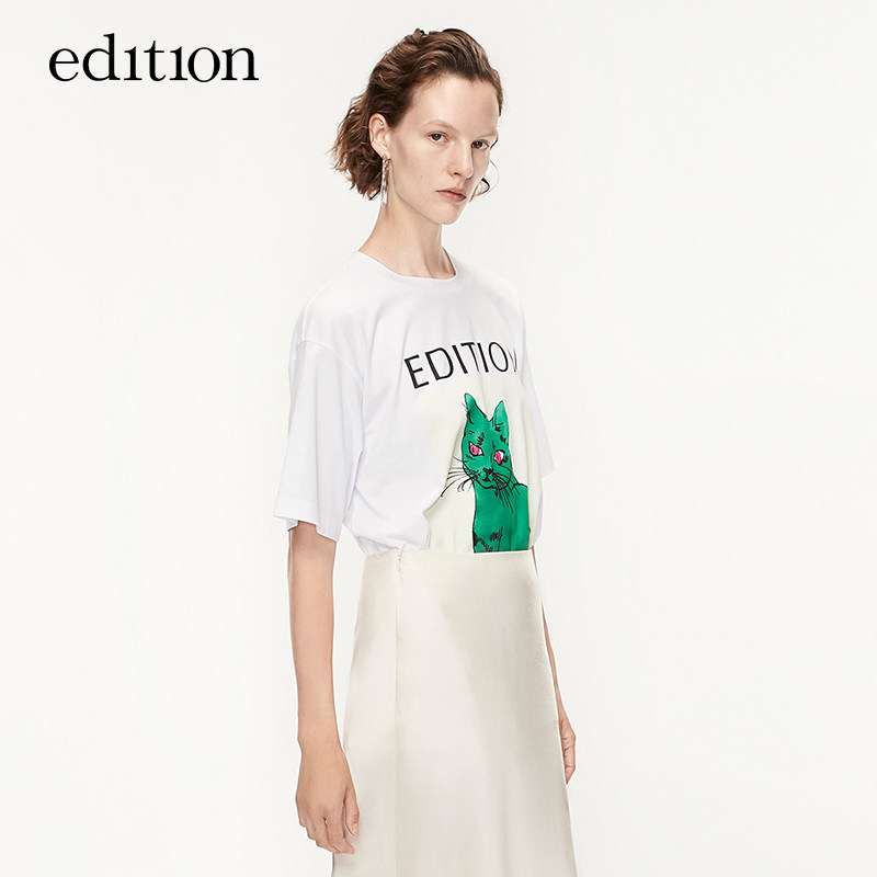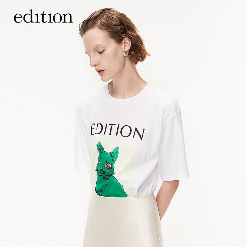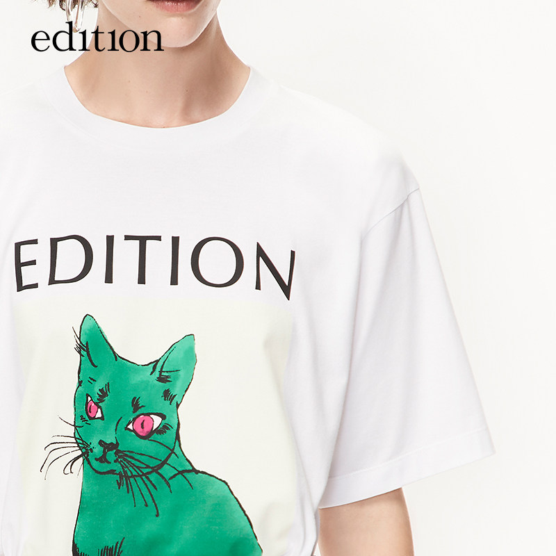 (Double 11 pre-sale) Qi Wei with edition white T-shirt female spring and autumn cat print cotton short sleeve