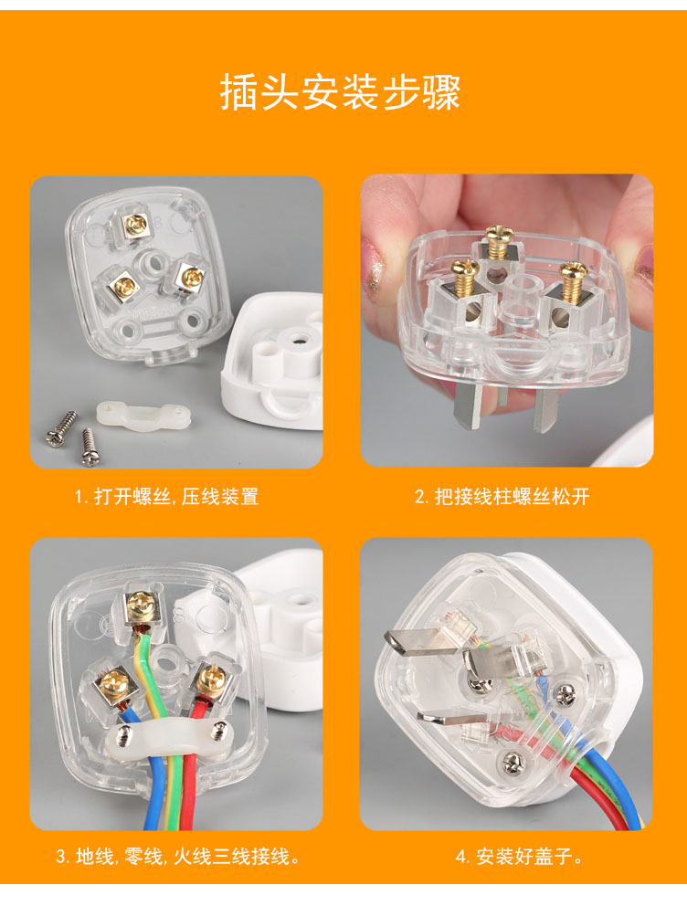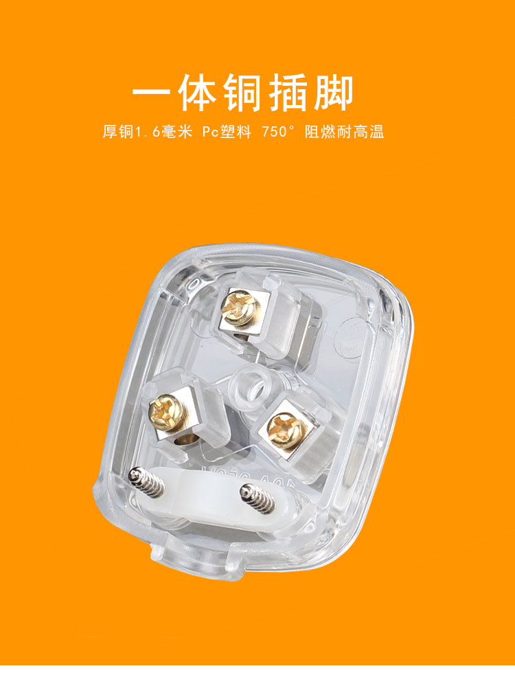 Transparent three-hole three-wire three-pole 250V three-pin 10A2500W power triangle three-plug 10A current plug household