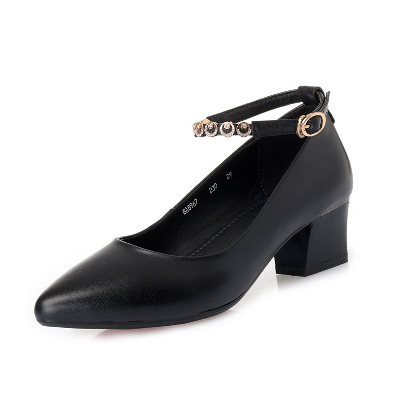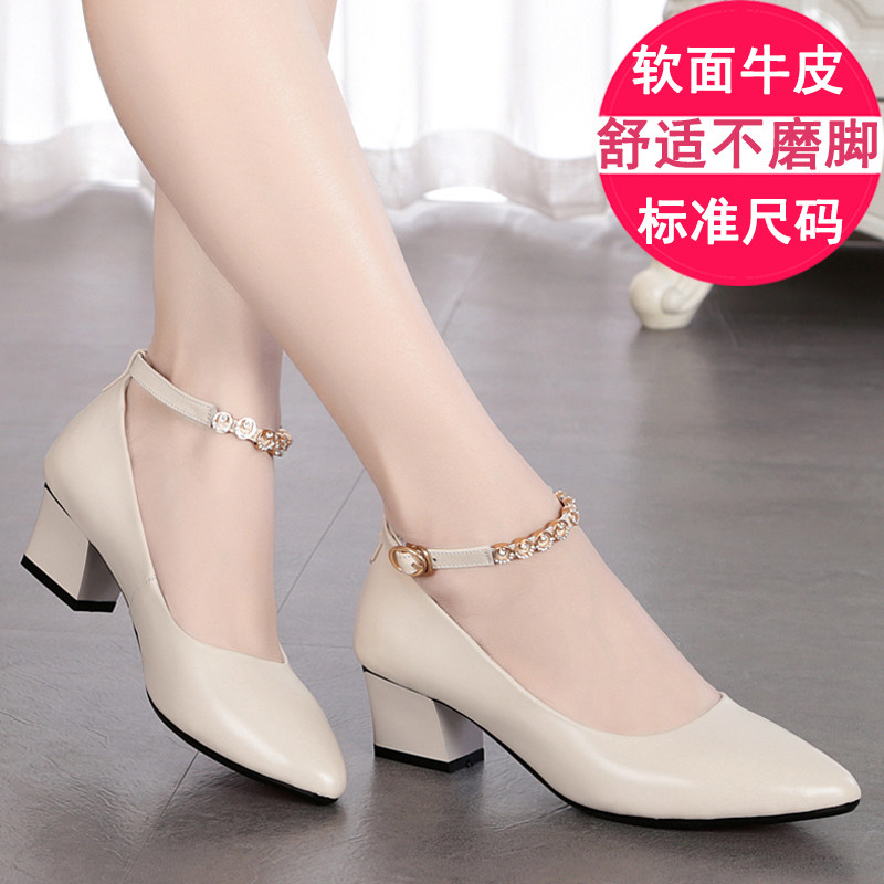 Red soft bottom leather shoes women's soft leather shoes medium heel thick heel mother one word buckle 2022 spring genuine leather shallow mouth women's shoes