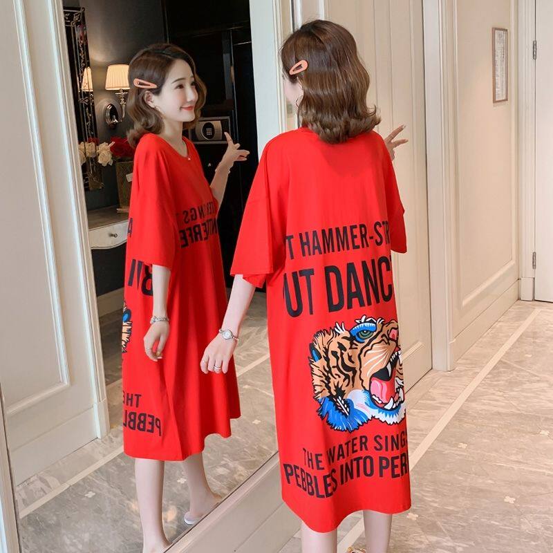 New pregnant women in spring and summer dress Han edition medium long cotton red short sleeve T-shirt loose coat large-code dress