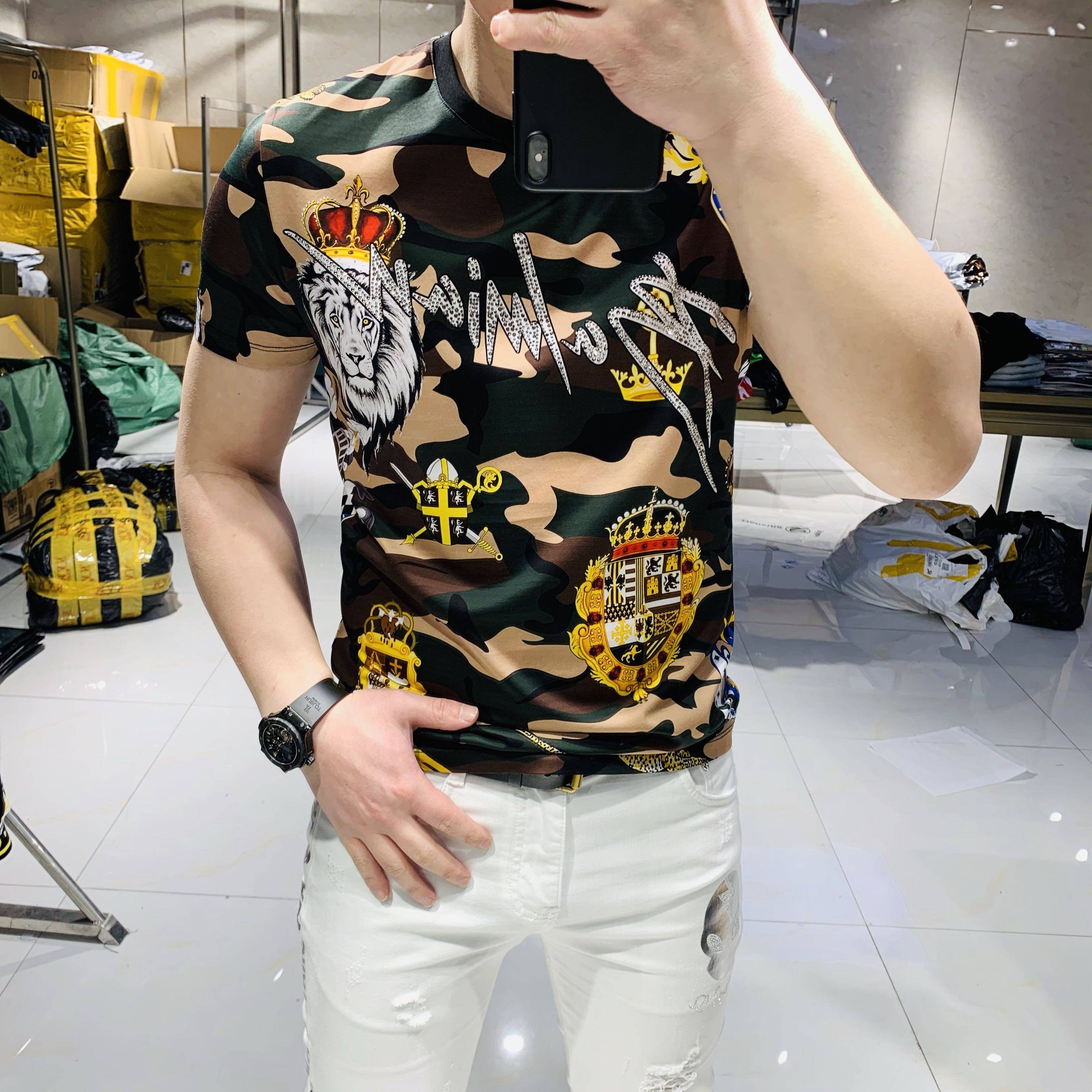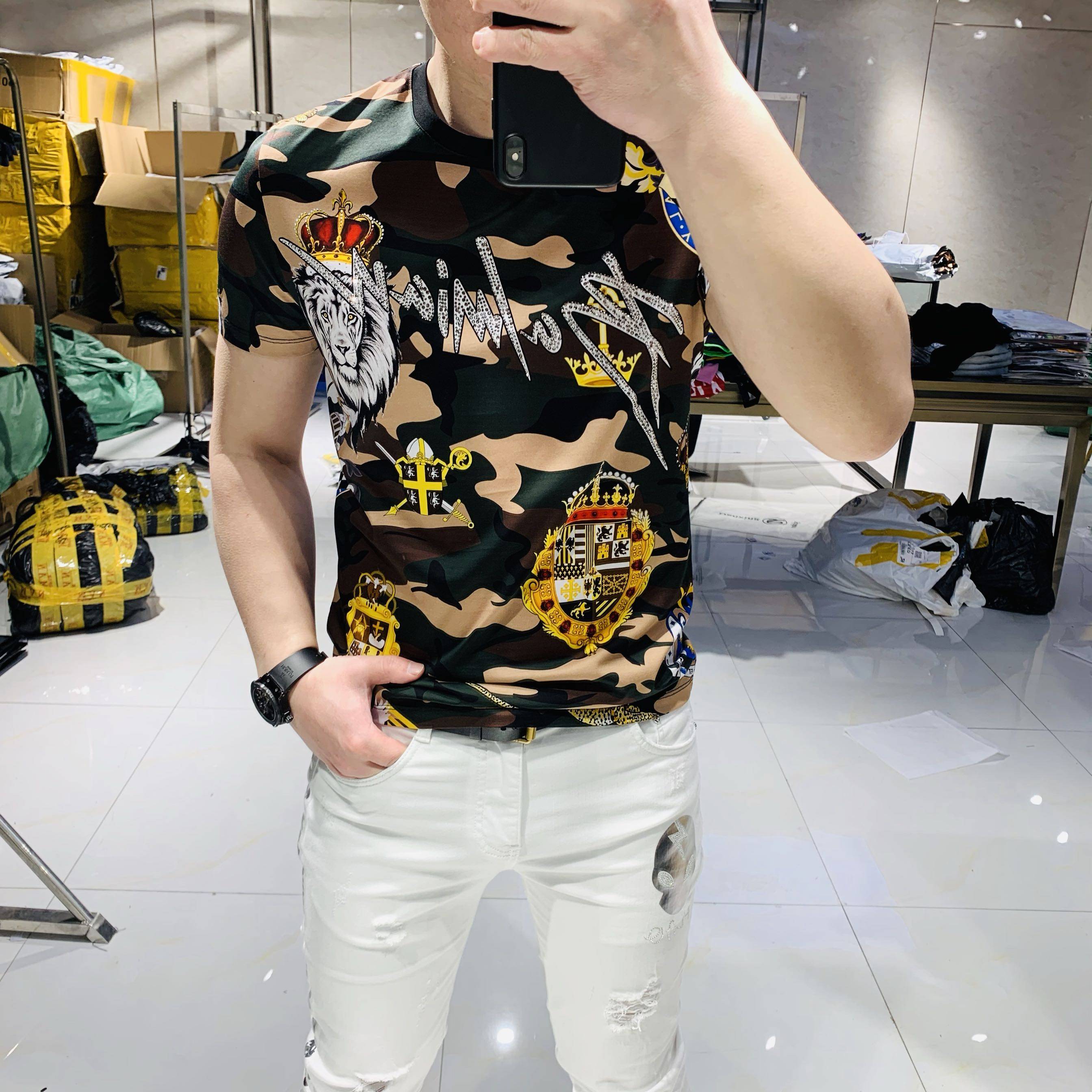 Short sleeve men's 2020 summer new double silk light cotton boomer camouflawless printed bronzed and drilled T-shirt with a handsome and half-sleeve T-shirt