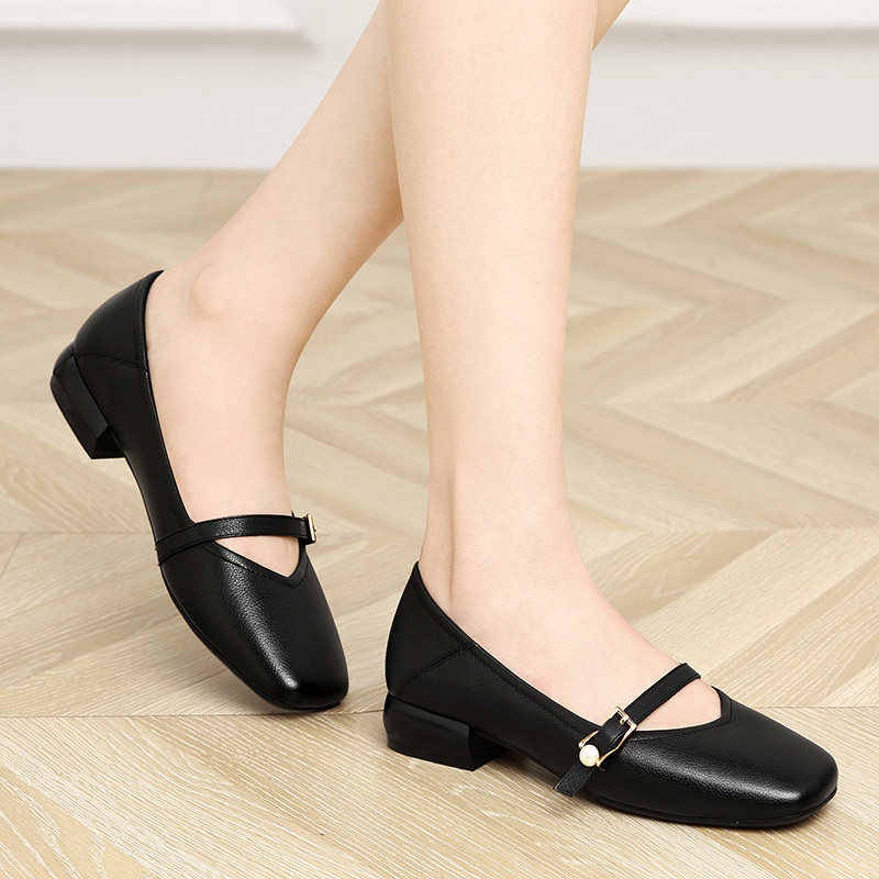 Grandma shoes female coarse heel 2022 Summer new soft leather soft bottom with bean and women shoes French style late wind small heel single shoes