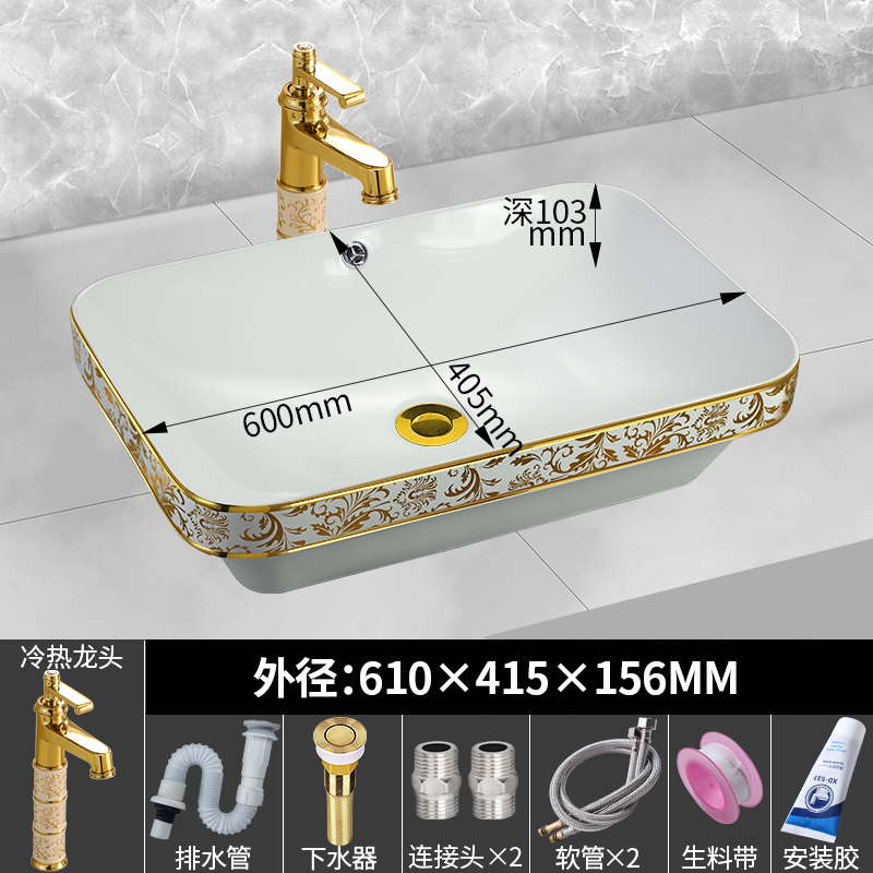 Rectangular white basin (only basin)Rectangular white basin Drainer square basin Silver round faucet all accessoriesRectangular gold basin (only basin)Rectangular golden basin