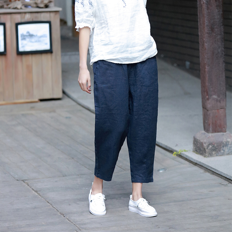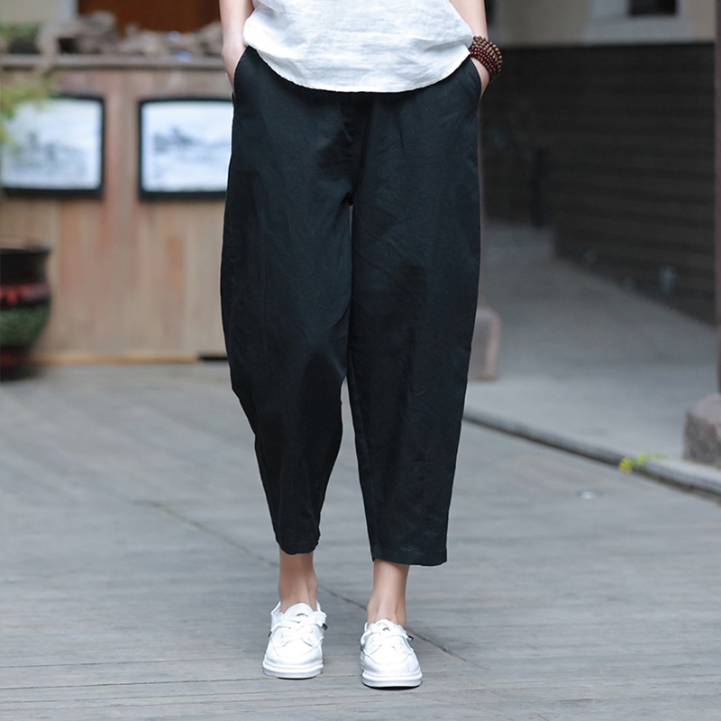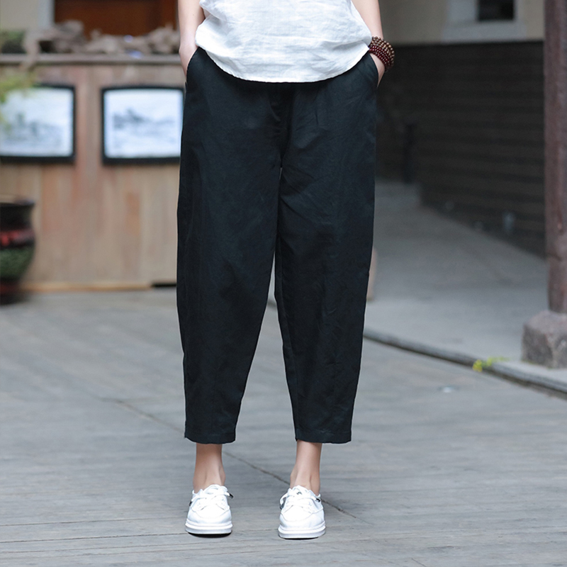 Summer retro cotton linen tai chi pants female art Harlan slack pants loose hemp meditation cropped pants small foot loo pants