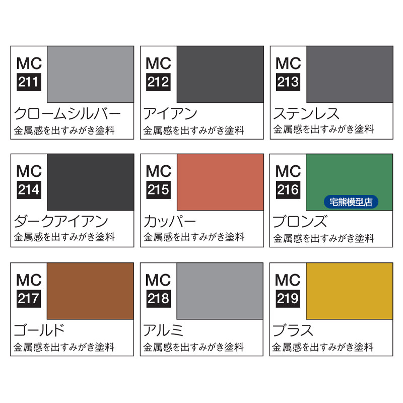 MC211 (chrome silver) MC212 (raw iron) MC213 (stainless steel) MC214 (raw iron) MC215 (copper color) MC216 (bronze) MC217