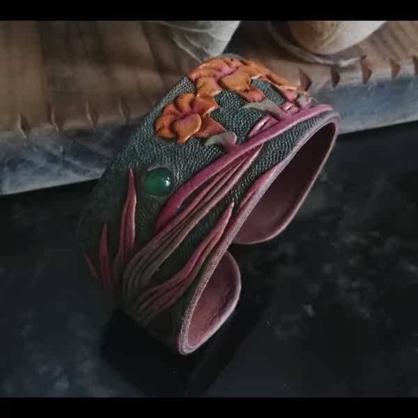 Handmade Tannic Bull Leather high-end custom-made leather Painted Grey Blue with green Manau women's hand ring hand