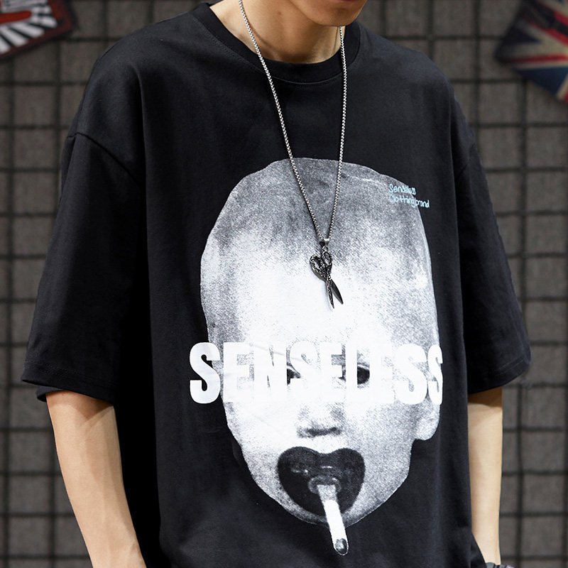 European and American High Street Chauffins Dark Black Wind Boy printed short sleeves T-shirt Men and women Ins couples Hip Hop Loose T-shirt