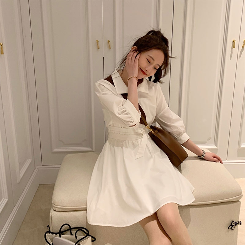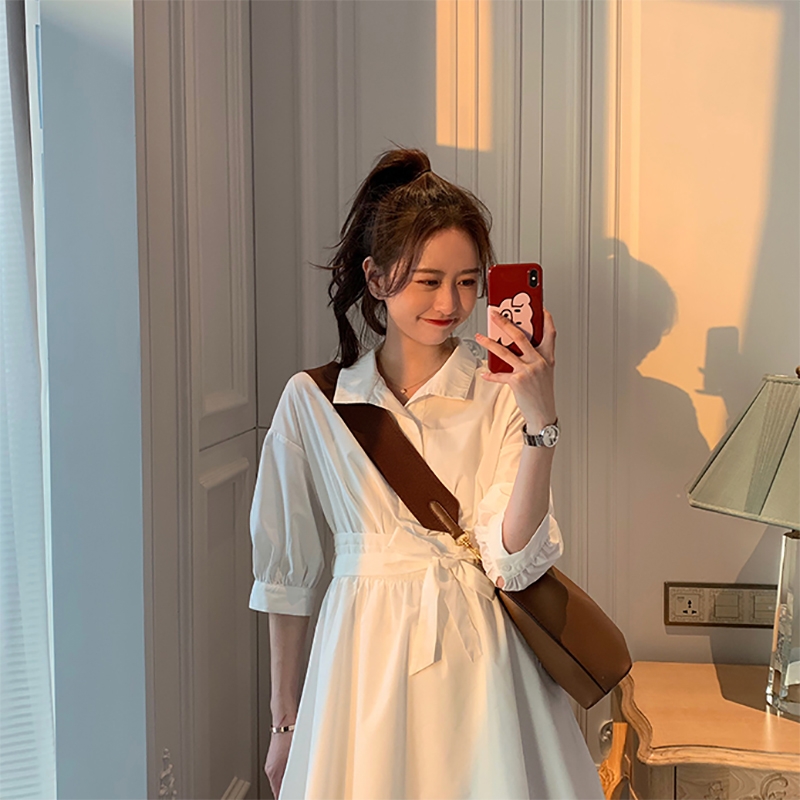 Europe station 2023 Summer new one-piece dress Female French style maiden school Wind to take up waist white shirt skirt-Taobao