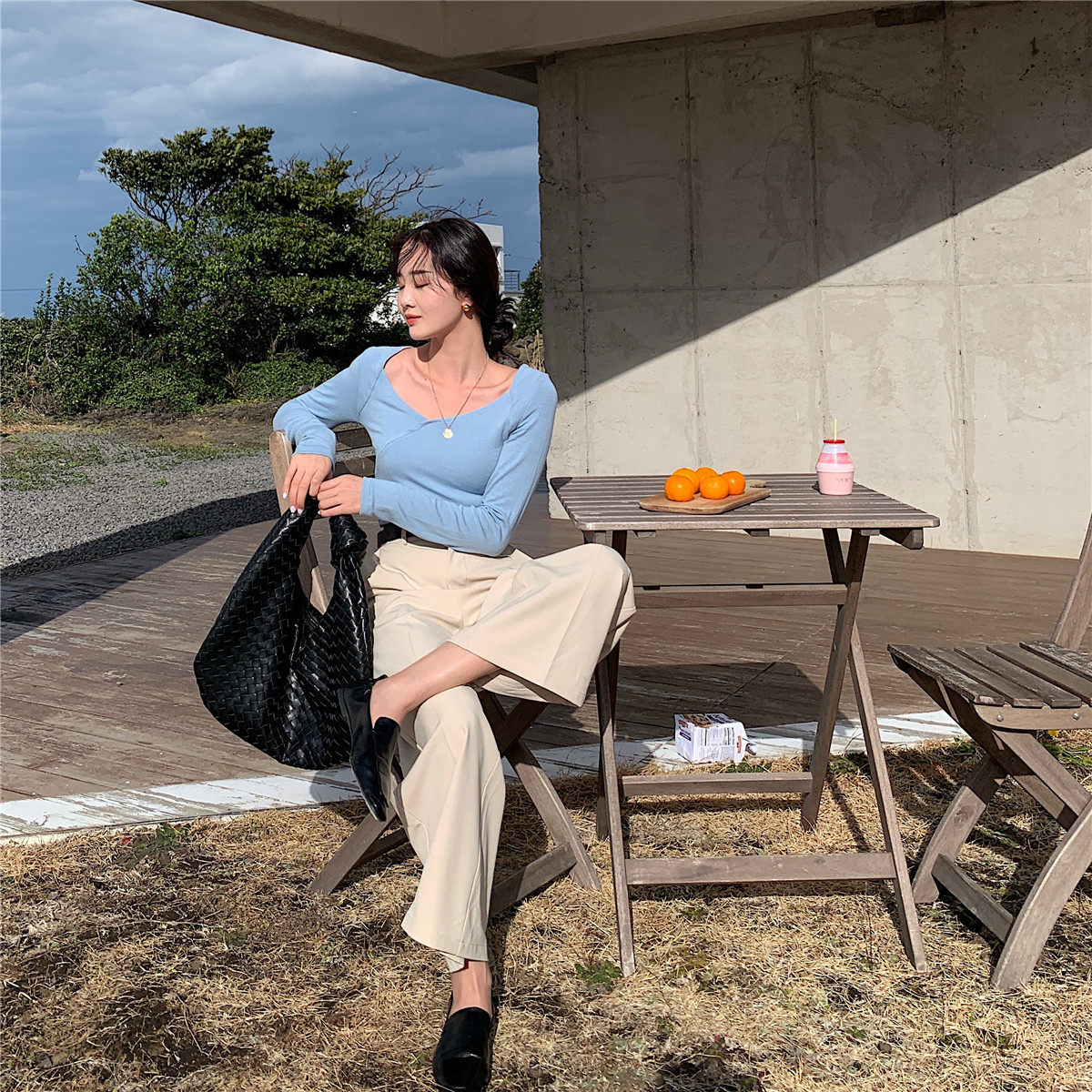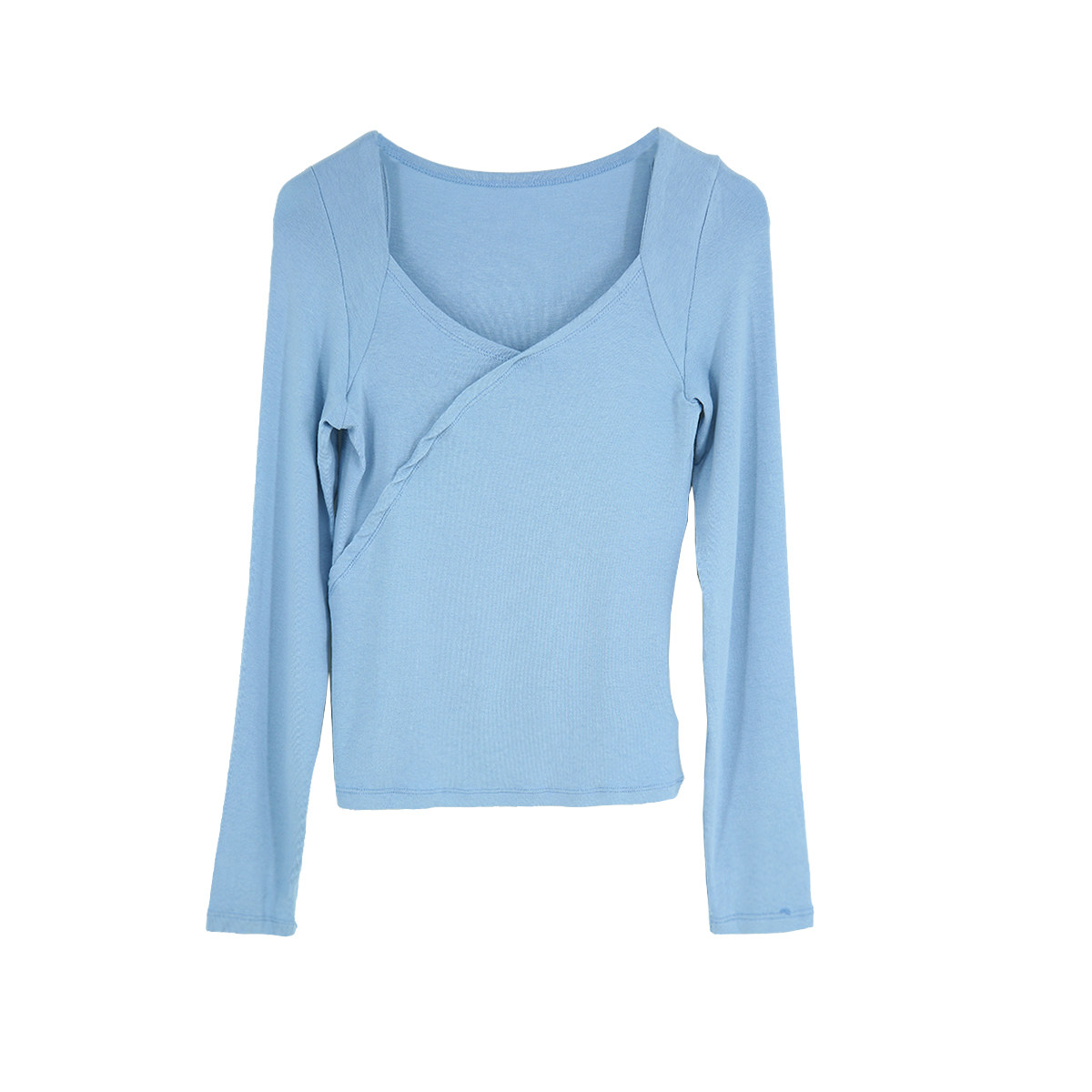 SYT Korean version 2022 Spring paragraph inclined collar 100 lap pure color blouse sexy V neckline with a long sleeve foreign T-shirt