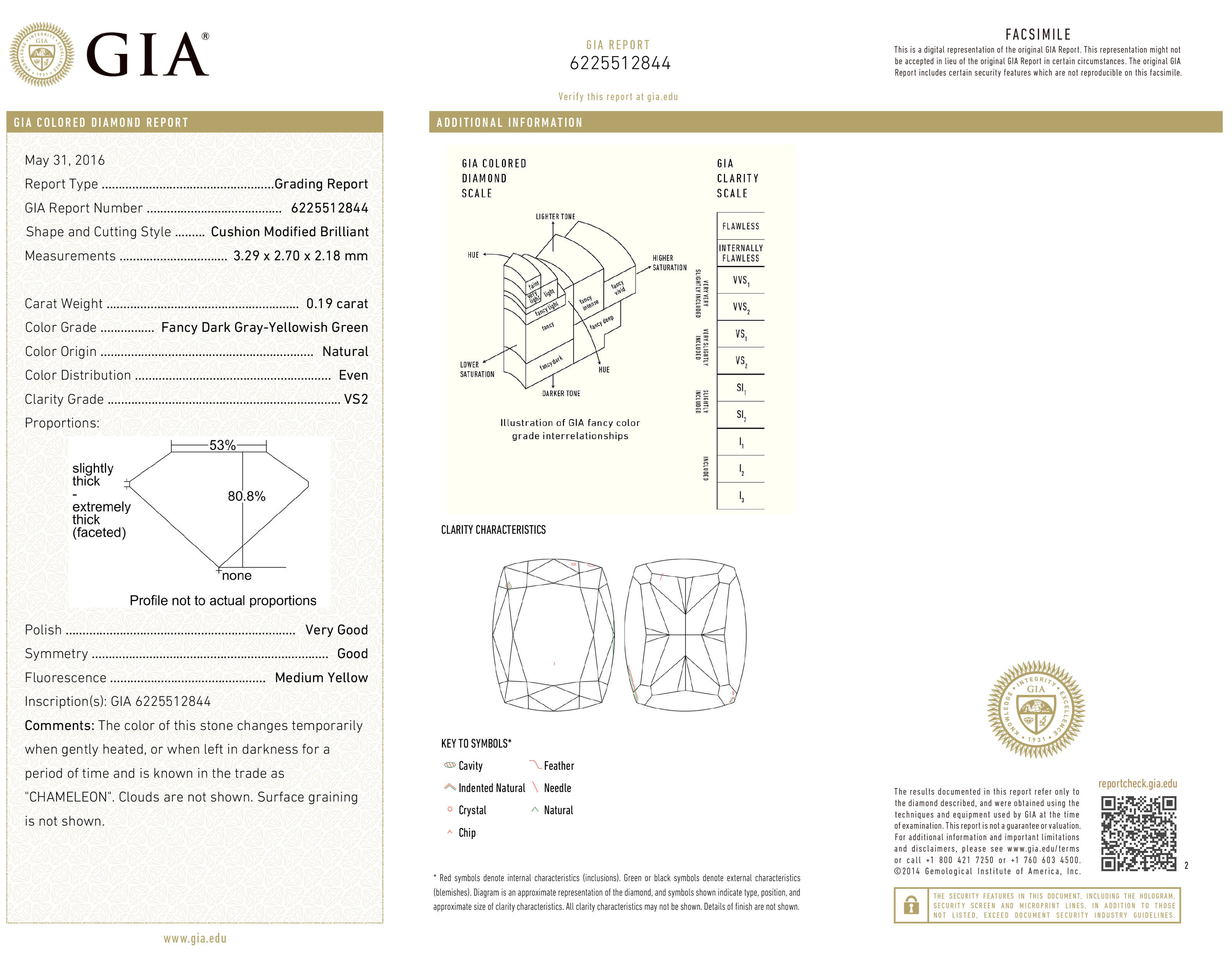 Chameleon colour diamond green diamond cushion type 0 19 carat FDGYG deep colour green yellow colour yellow colour GIA International certificate VS2