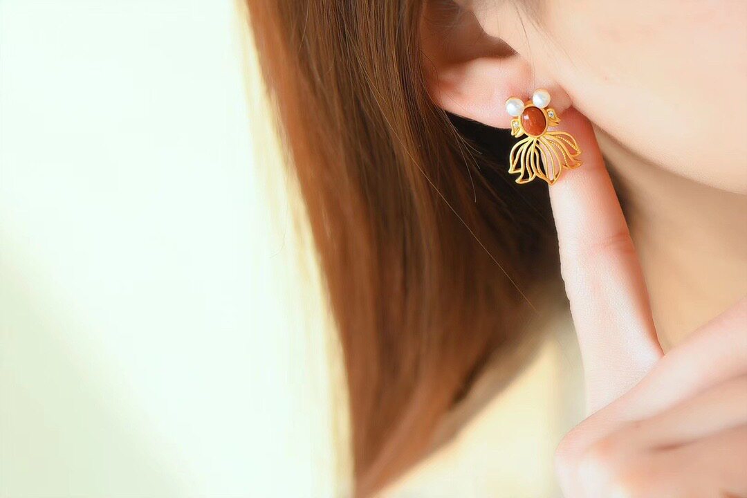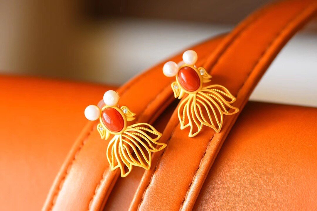 Sichuan stock full of meat South red persimmon red inlaid 925 silver gilded goldfish earring ear pin