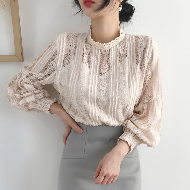 Lace Xiaojersey Women in spring South Korea Retro Long sleeves T-shirt Loose Display Slim Cover Hollowed-out Mesh Yarn Shirt Blouses