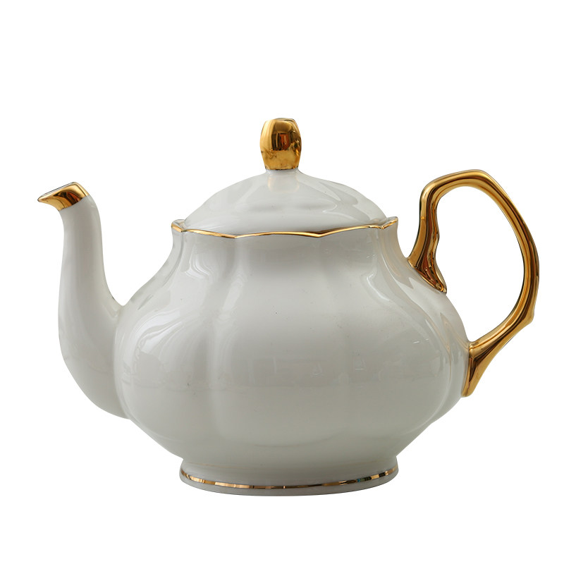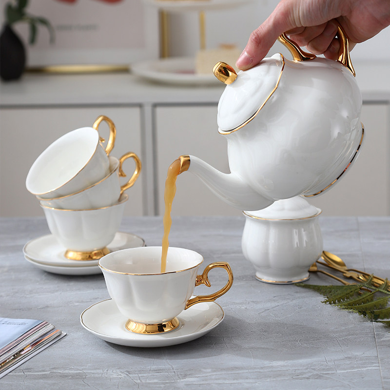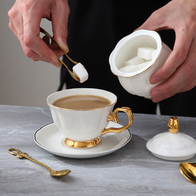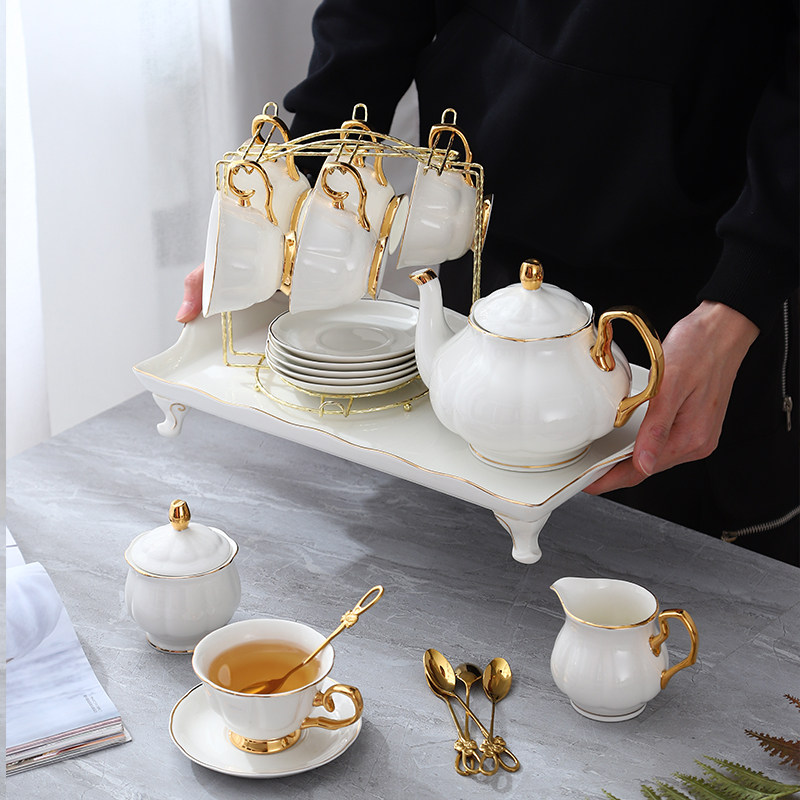 One cup, one plate, one golden spoon (full gold in English), large ceramic tray, one pot, 2 cups, 2 saucers and 2 ceramic spoons, Twist iron rack (2 golden spoons and 2 forks), one cup, one plate, one ceramic spoon (full British gold)