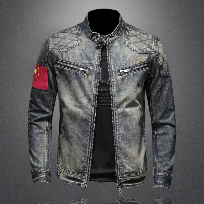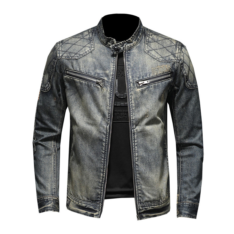 2021 Spring Autumn Retro Vintage Denim Jacket Male Tide Card European and American Street riding Locomotive Clothes overalls Collar Youth Jacket