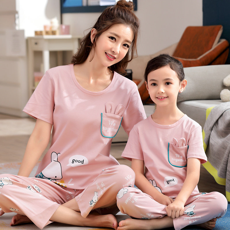 Girls' pajamas summer middle and large children's short-sleeved pure cotton baby girl parent-child home clothes children's mother-daughter pajamas Bikachao