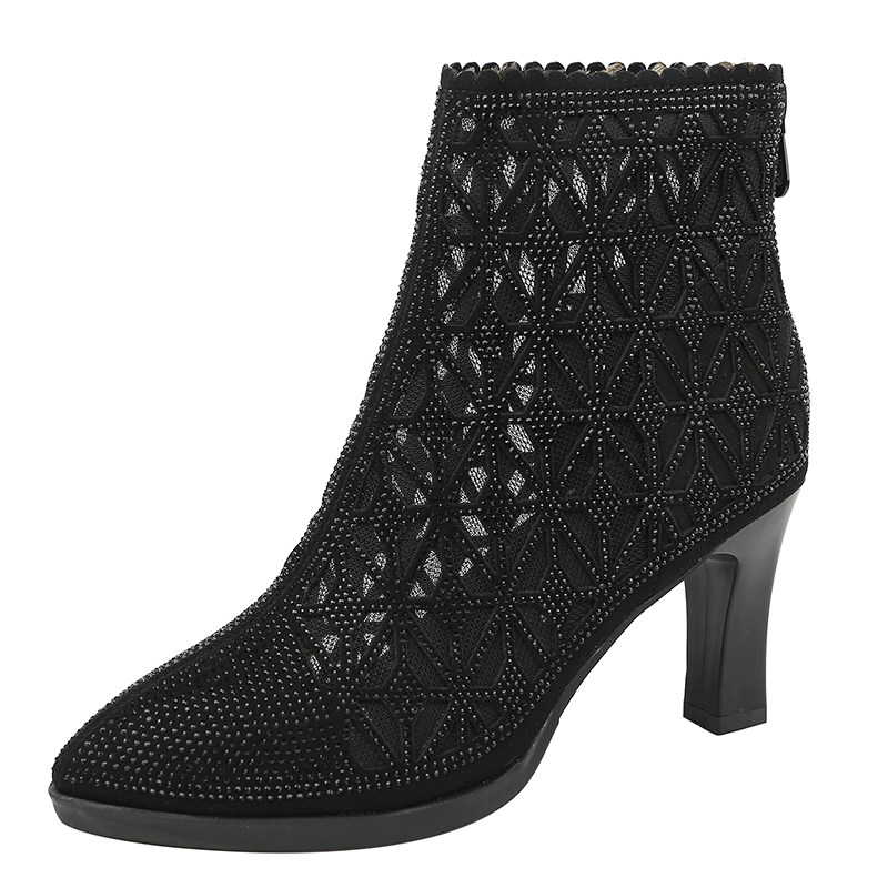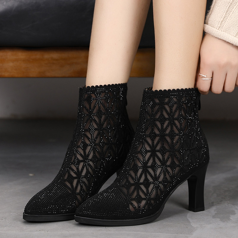 2022 New High Heel Spring Autumn Single Boots Woman Hollowed-out Mesh Yarn Boots Coarse Heel Martin Boots Breathable Mesh Shoes Pointed Short Boots