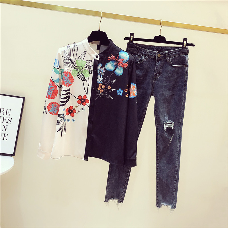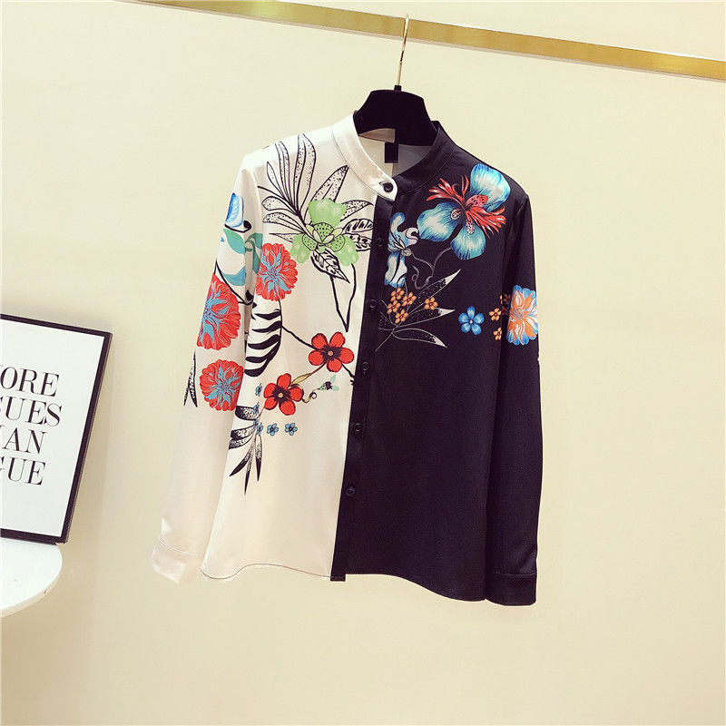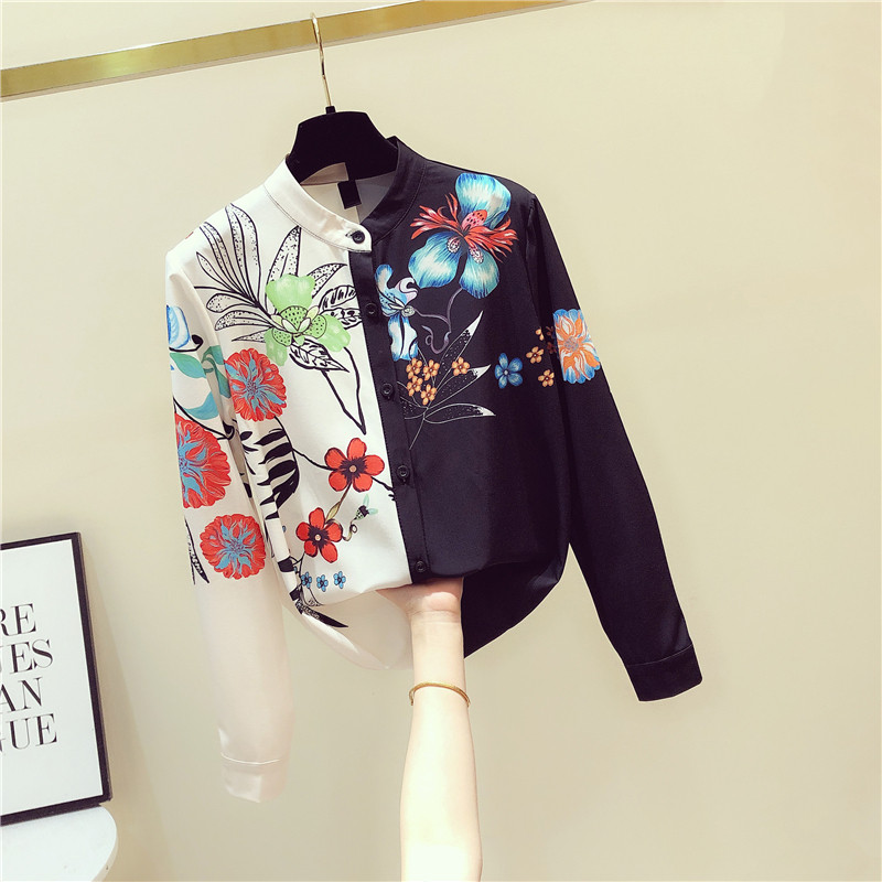South Korea Retro Printed Collision Color Right Collar Black Shirt Woman 2021 Chunqiu New Design Sense of a small crowdsourced blouse