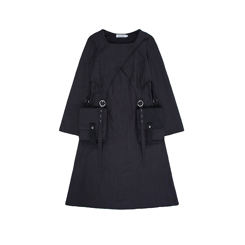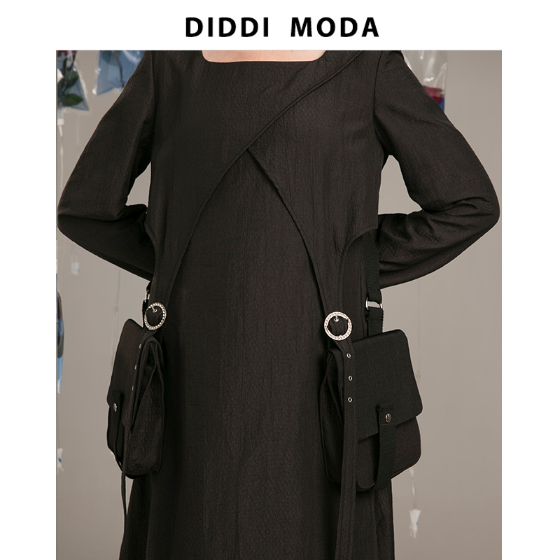 DIDDI Original design white black ocean dress Long sleeves Double pockets design Slim Long Dress 2021 New