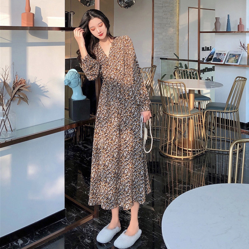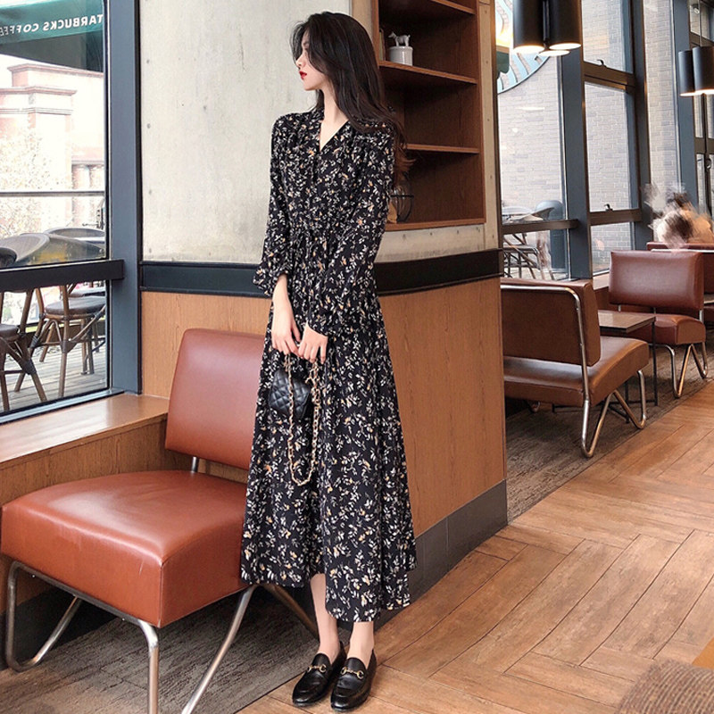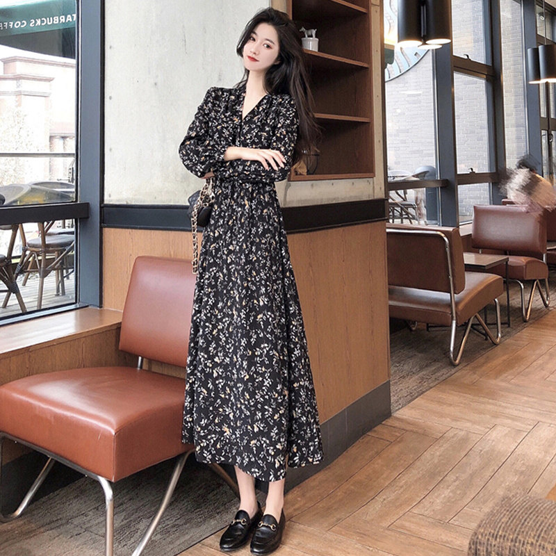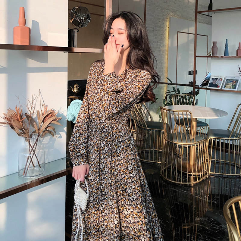 2021 Spring and Autumn Bellflower Chiffon Floral French Long-sleeved Dress Slender Long Skirt Ankle Fairy Forest Fairy