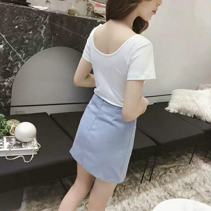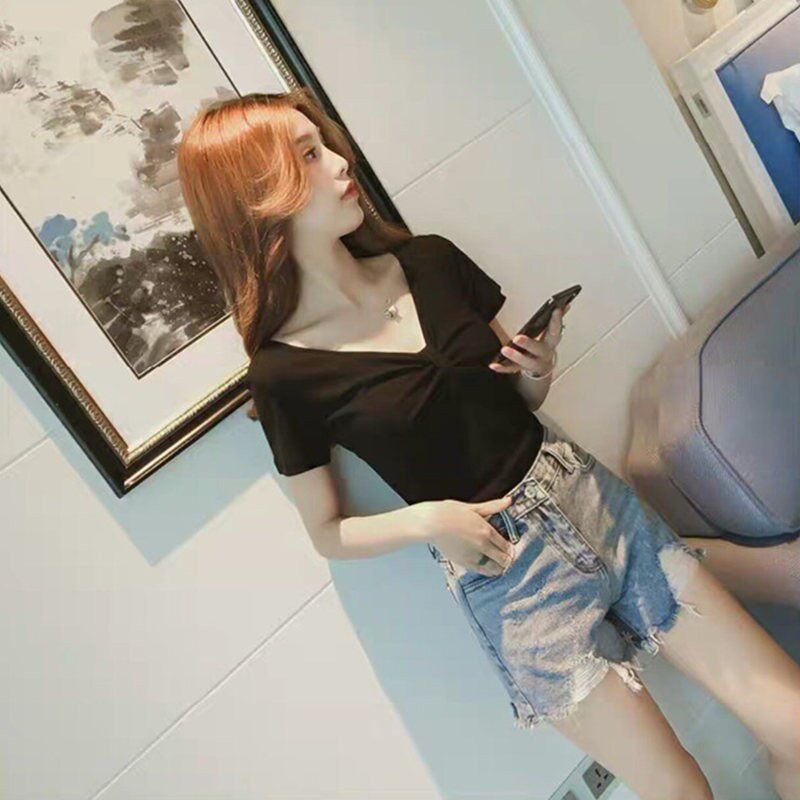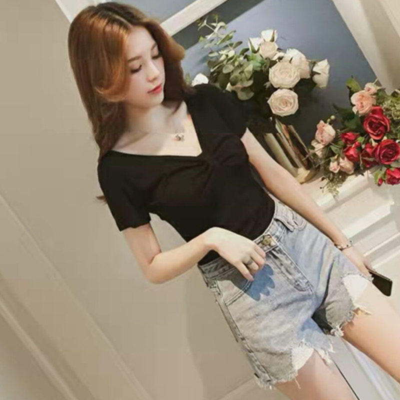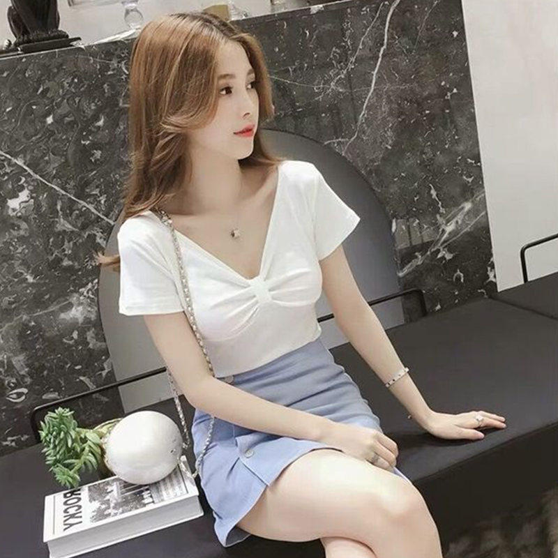 Tide-card short sleeve t-shirt female ins Chaoy breeze Small crowdsourced design emotive sensation V collar for short and pleated upper clothes
