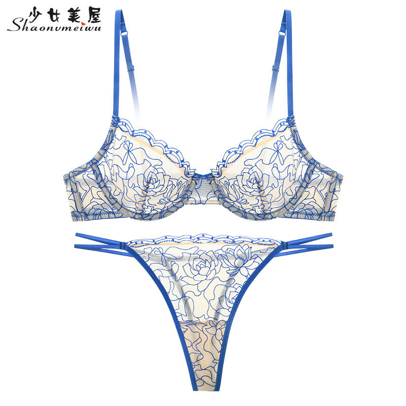 Girl beauty house ultra thin transparent European and American sexy underwear embroidered lace bra T pants bra bra set female bra
