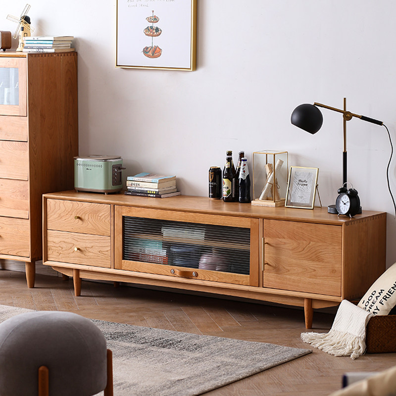 Nordic solid wood TV cabinet coffee table combination Japanese living room small apartment simple log color cherry wood style furniture