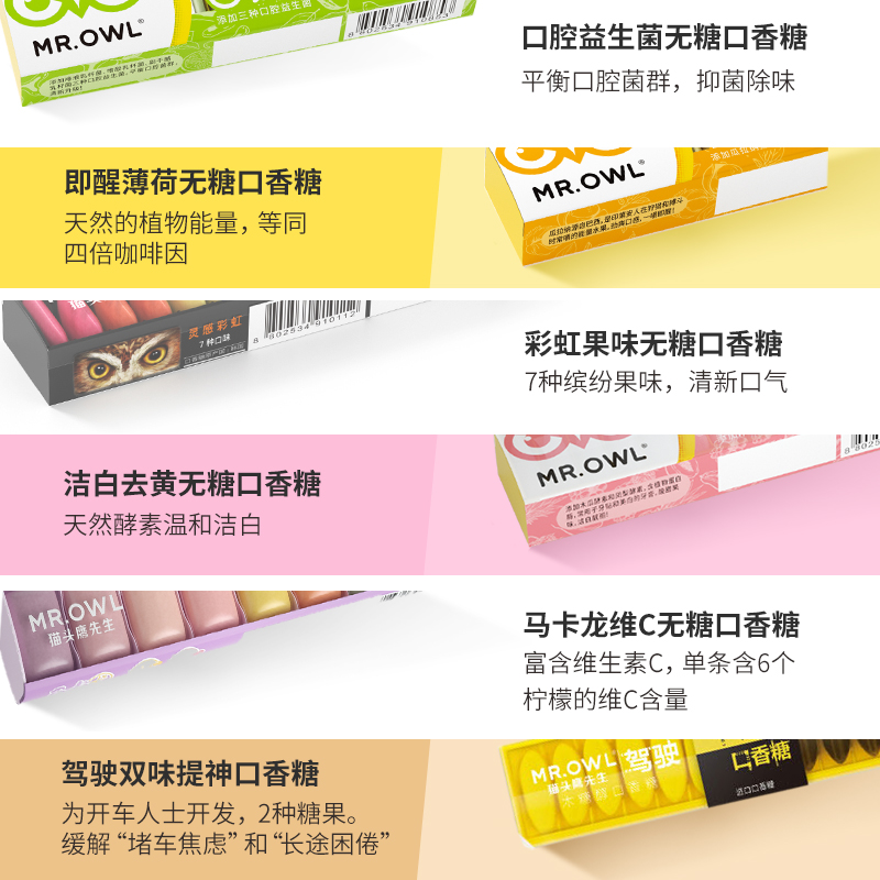 Chewing gum sugar-free rainbow candy fresh breath mint xylitol box with Mr. Owl kissing strip