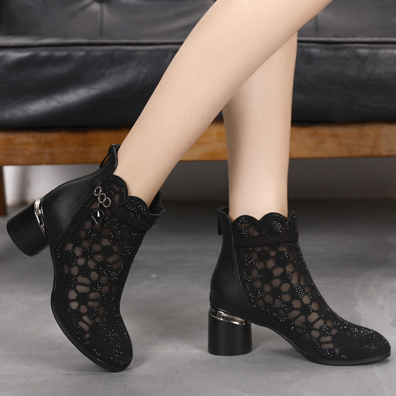 Spring Summer Season Women Shoes Hollowed-out Mesh Boots Coarse Heel Short Boots Woman Spring Autumn Single Boots Mesh Yarn Boots Cool Boots Water Drill Breathable Big Size