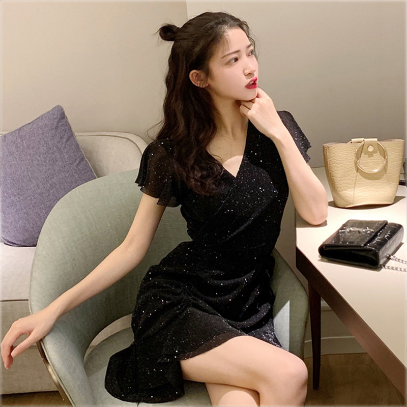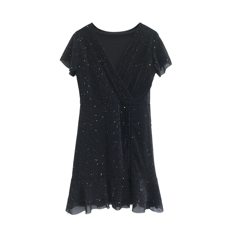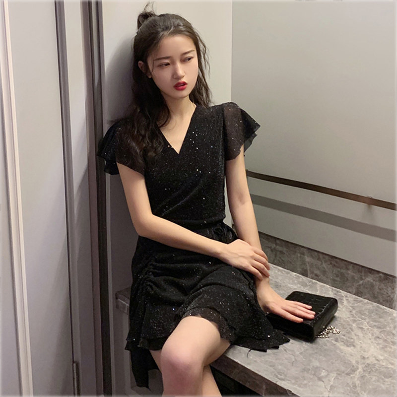 2022 Spring Summer New Nightclub Sexy Sequins Little Black Dress Goddess Fan Super Fairy 1 4 inches sleeves Wrench Sleeves Shorter subocean dress