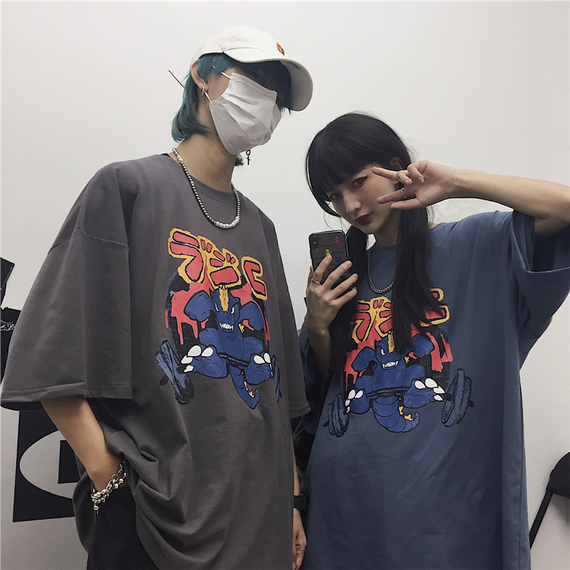 2021 summer new Korean version Harajuku style cartoon printing dinosaur loose short-sleeved T-shirt top men and women ins tide