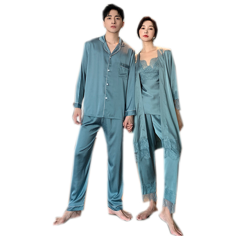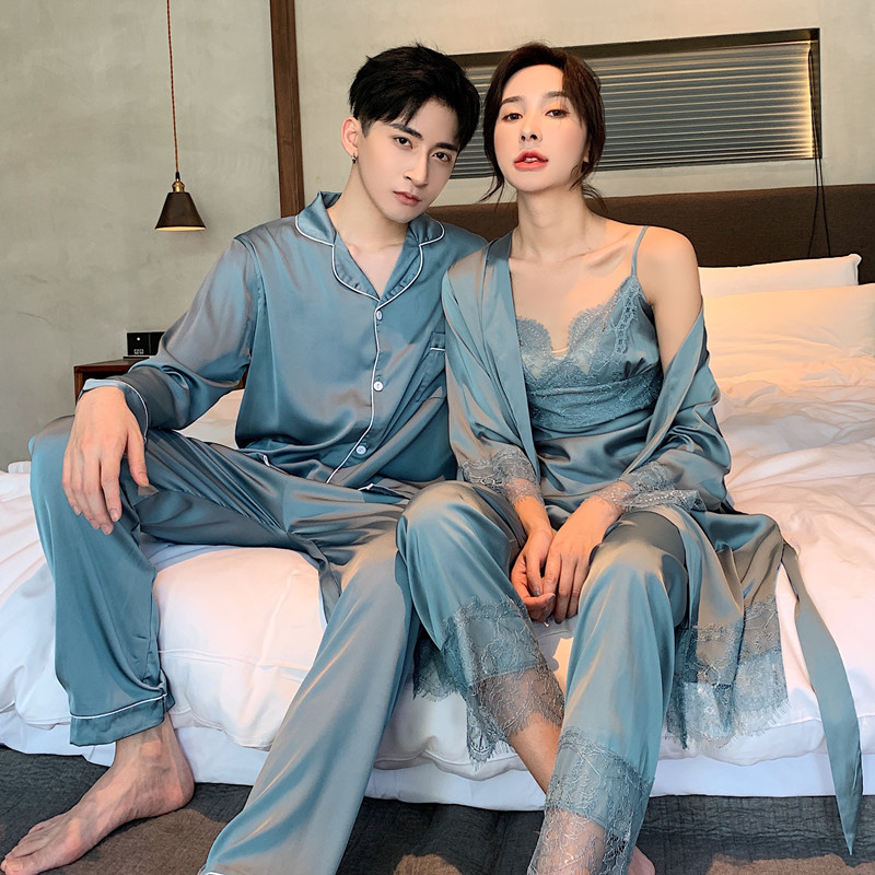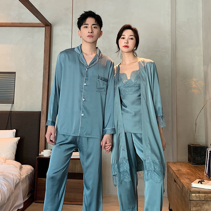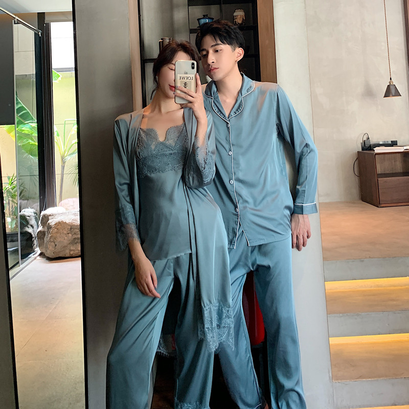 IF-KANN Spring and Autumn Han Edition Silk Men's Home Casual Minimalist Ice Silk Lovers Pyjamas Three Sets Women's Thin