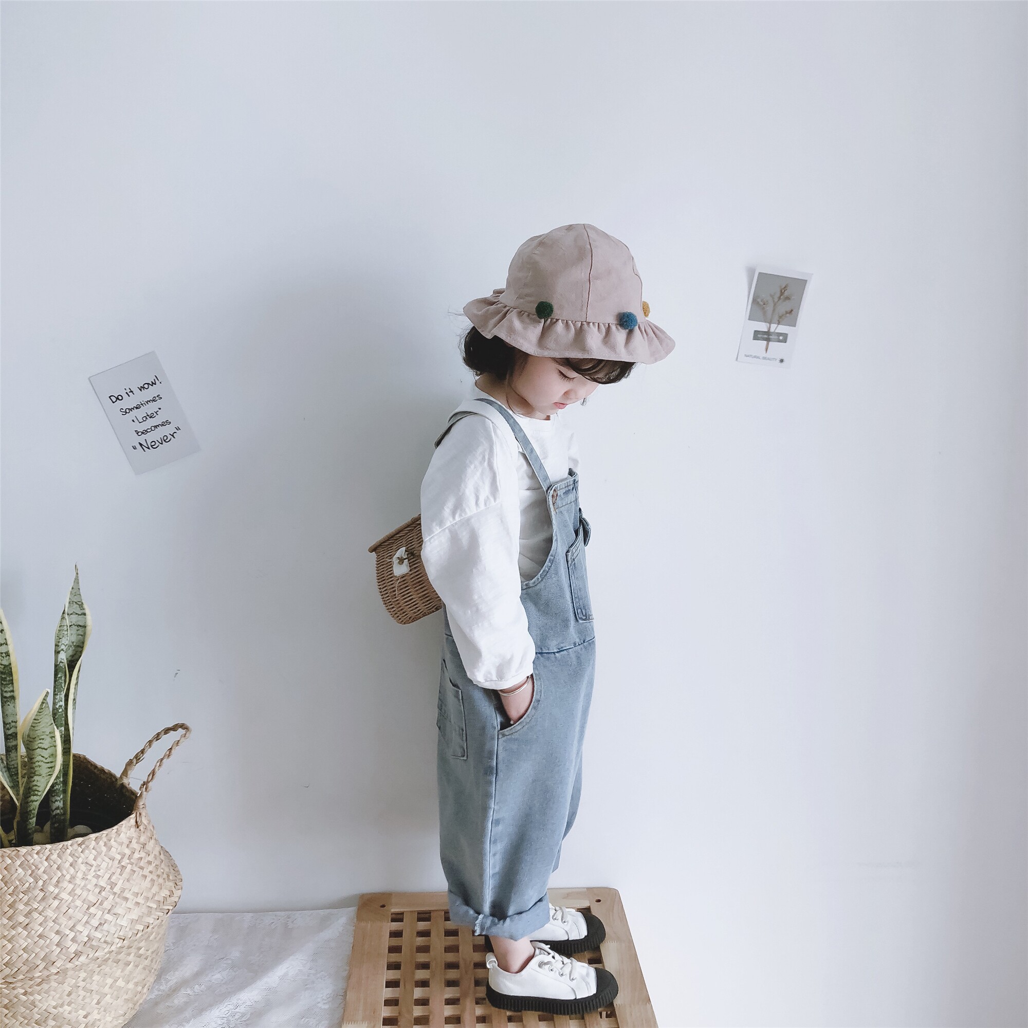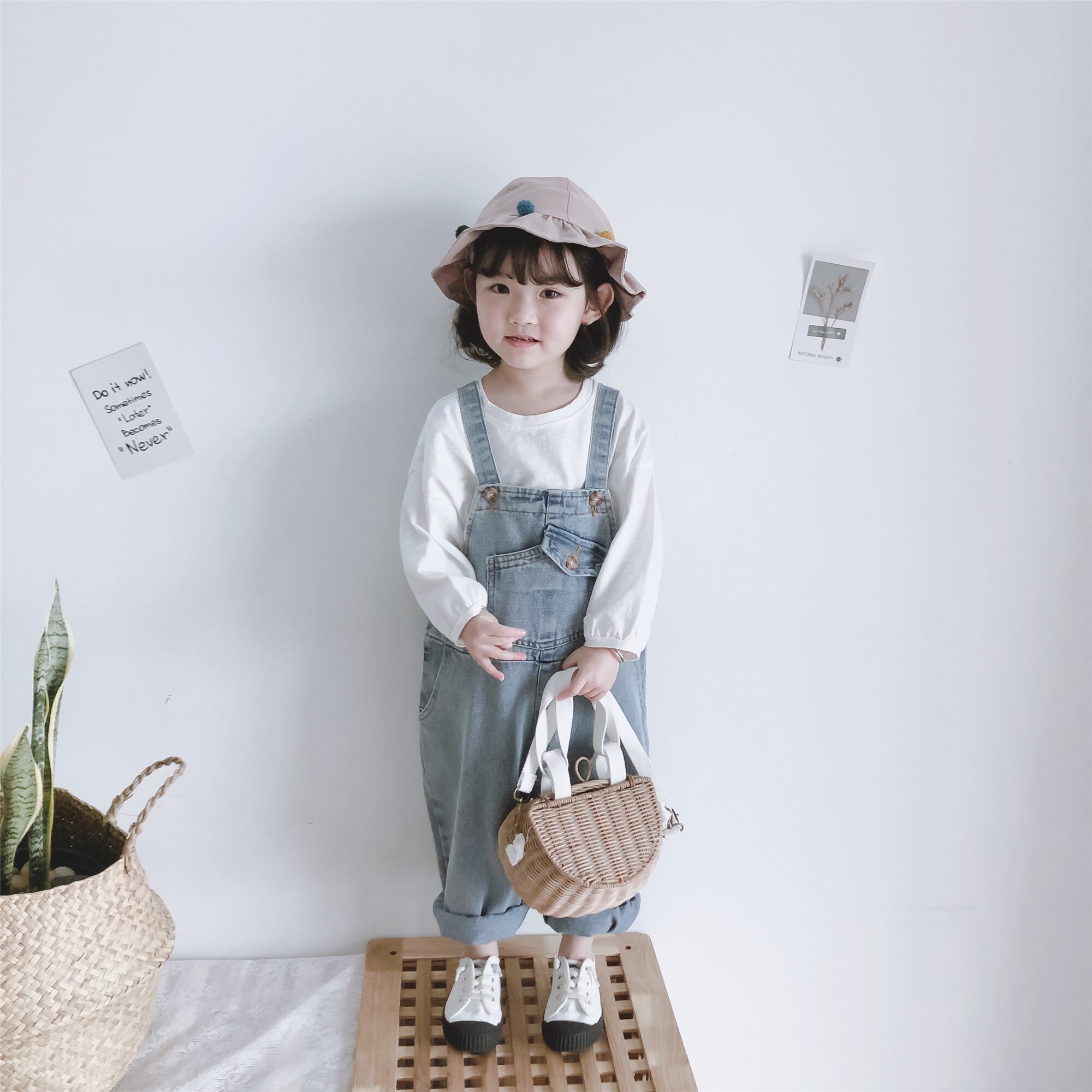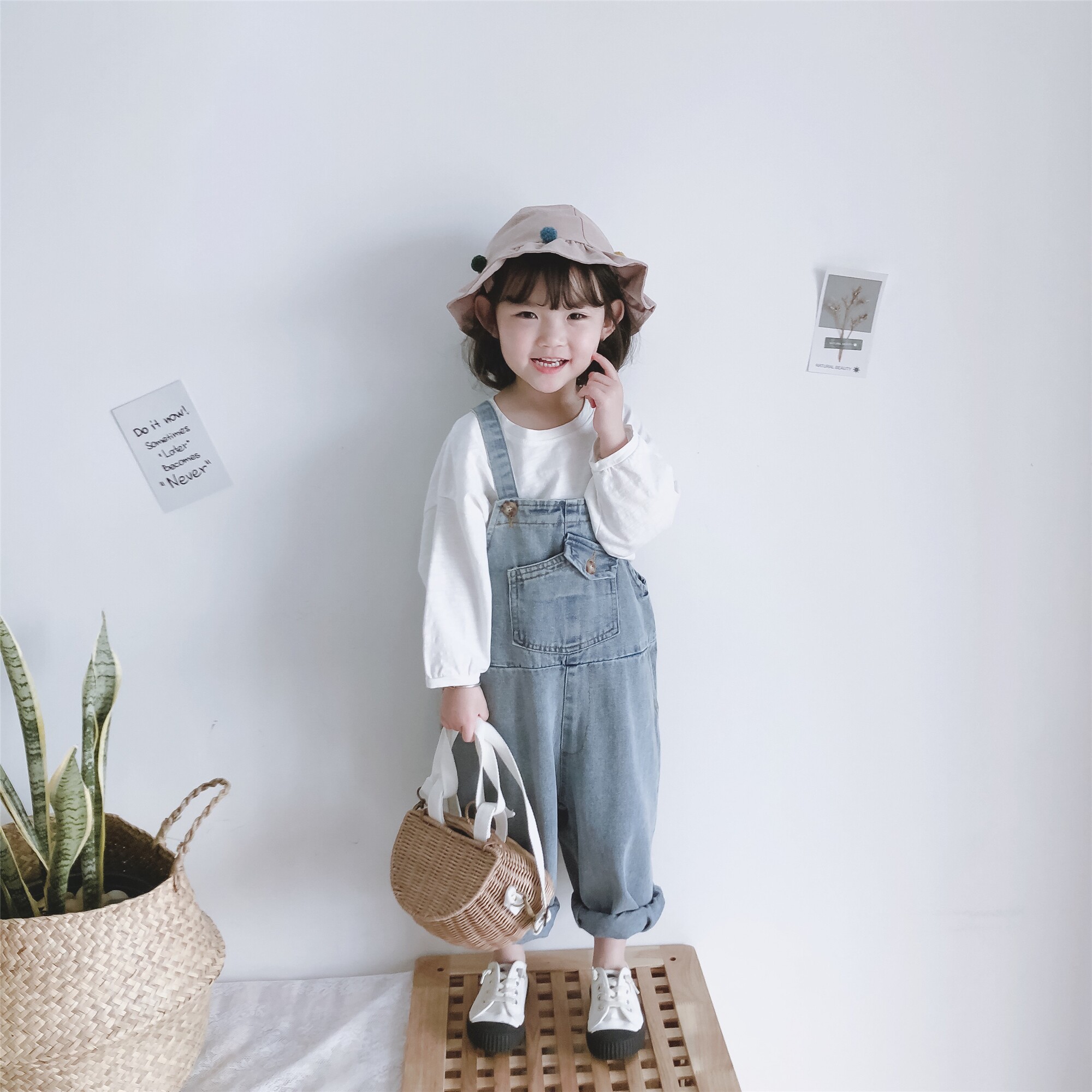 Single piece light blue denim holding baby bag pants (spot) single piece white doll T (spot) single piece white doll T (pre-sale) single piece of light blue denim holding baby bag pants (pre-sale)