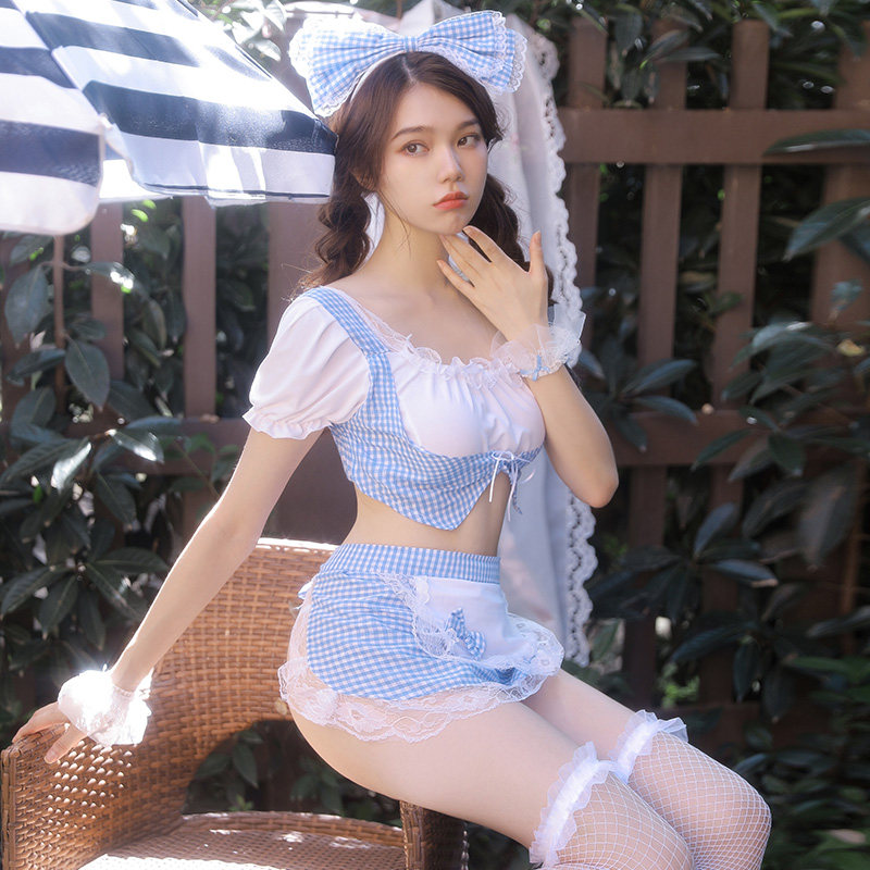 Love Lingerie Sexy Pyjamas big size Maid Dress Blue Lattice Apron Uniform Seduction Suit Passion Transparent Fire Lady