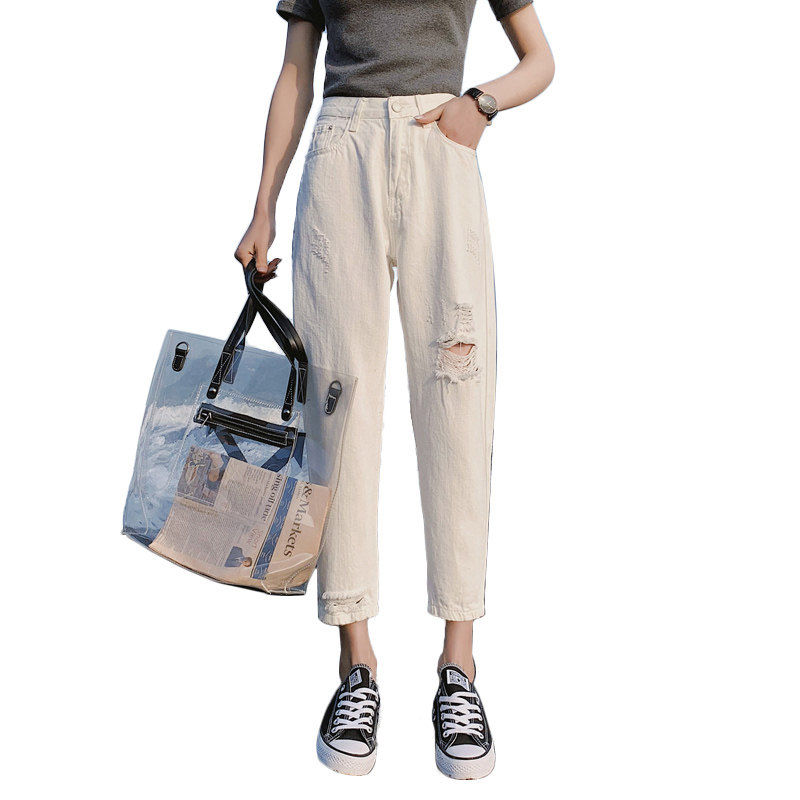 Ripped jeans women's 2021 summer new loose straight daddy pants ins nine points high waist thin Harlon pants
