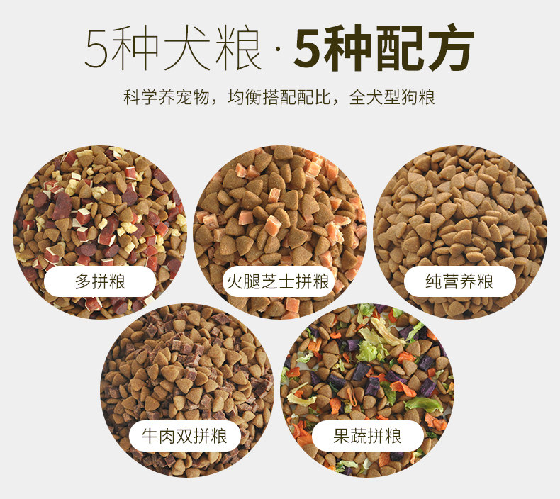 One pound of each of the five flavors, 40 pounds of multi-grain (cheese, salmon, meat), 40 pounds of vegetables, 40 pounds of beef, 40 pounds of ham, 40 pounds of nutritious pure grain, 40 pounds