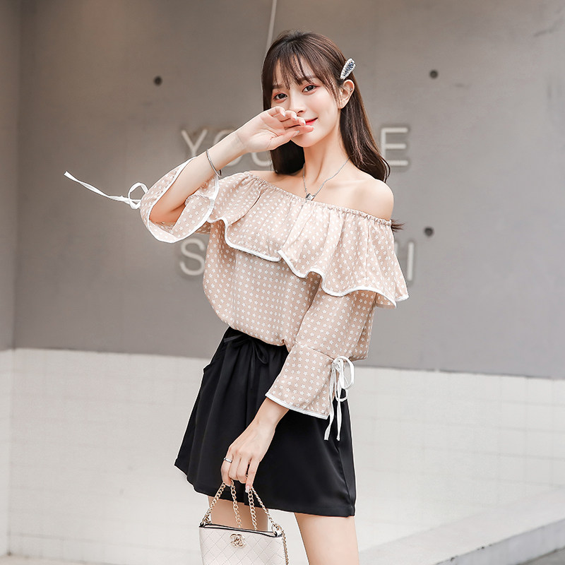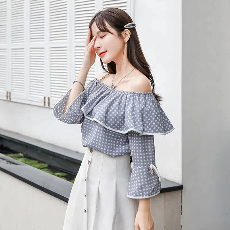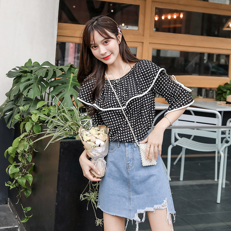 Collarbone Blouses Cardigan Design Sensation Retro Heben Wind Display Slim Summer Straight Shoulder Blouse Short Sleeve Round Point Snow-spinning Cardigan