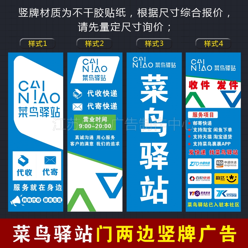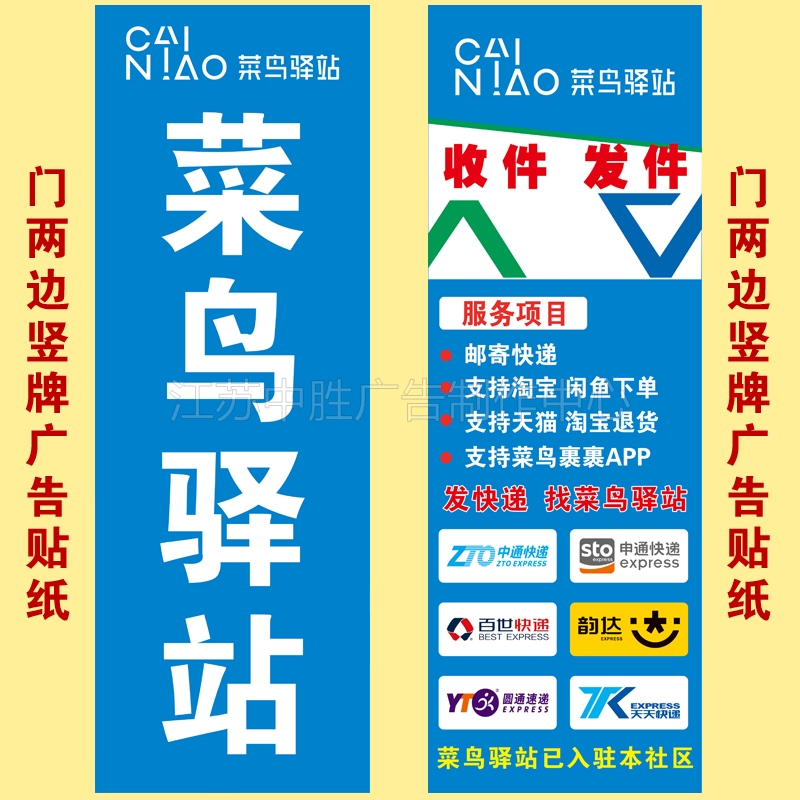 On both sides of the door of the rookie station, there are vertical advertising poster stickers and sticker plaques with signs for collection and delivery