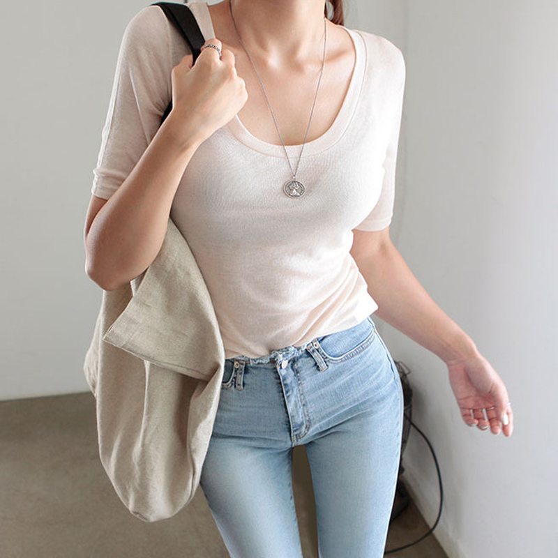 Spring and summer Korean version of simple solid color thin crew neck tight thin models careful machine top short-sleeved five-point sleeve T-shirt women