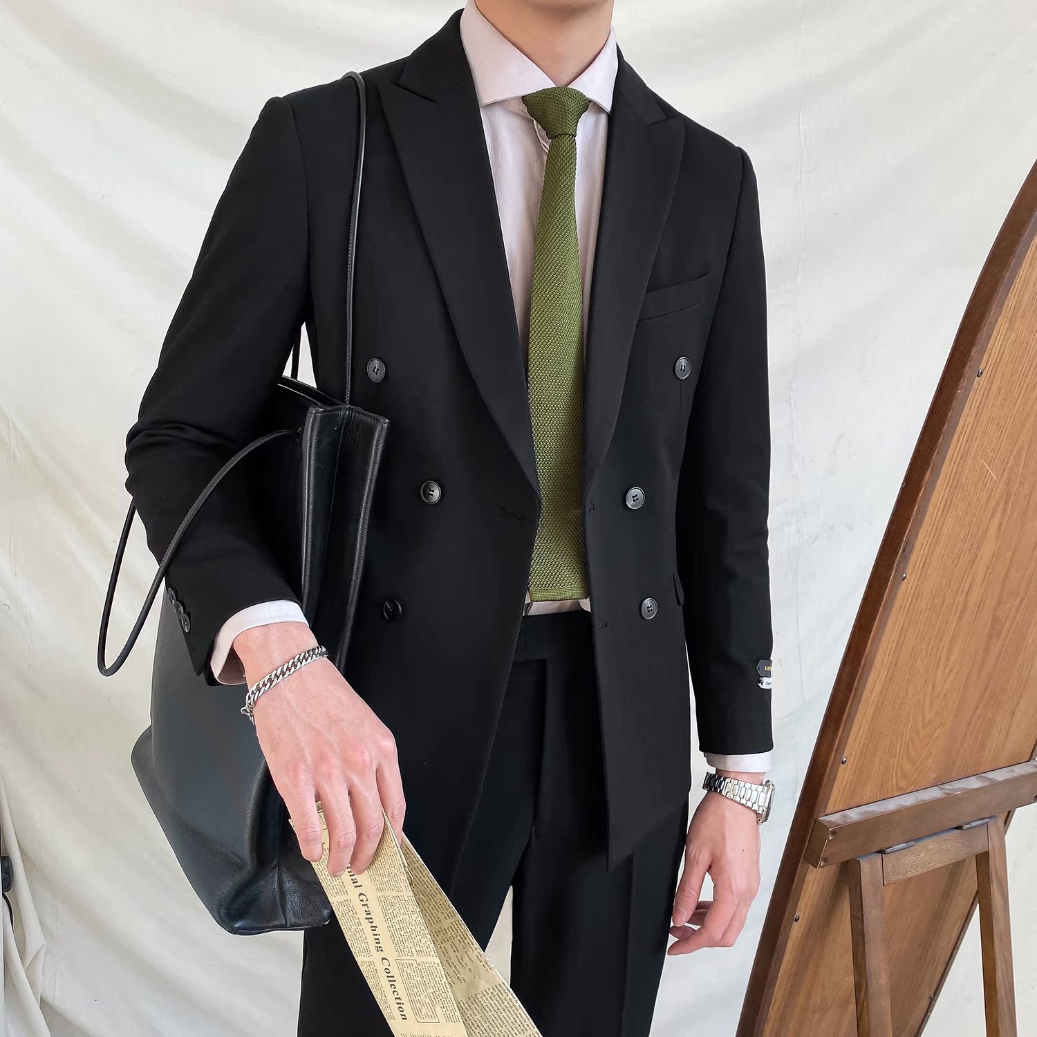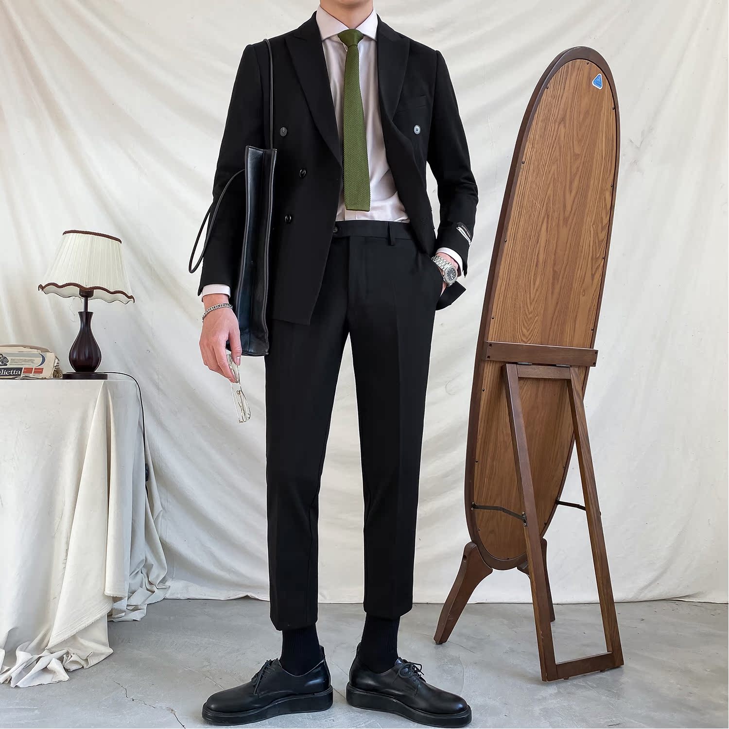 Business casual blazer two-piece men's Korean slim double-breasted British suit suit Wedding groom