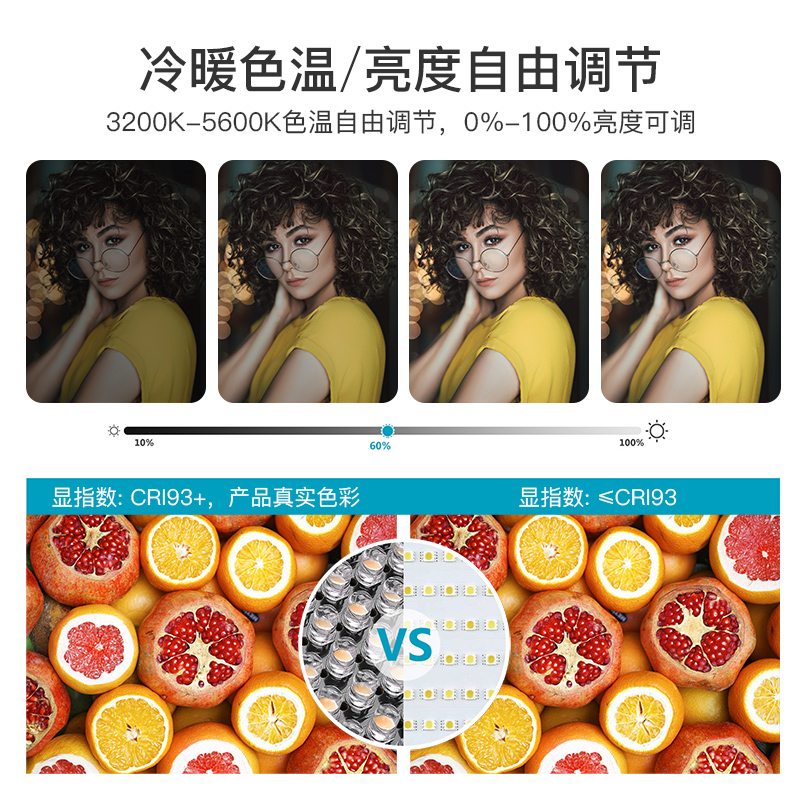 Standard white light (5500k 200k 200k or 5600K 5600K 200K) warm light (2700K-3500K) adjustable colour temperature
