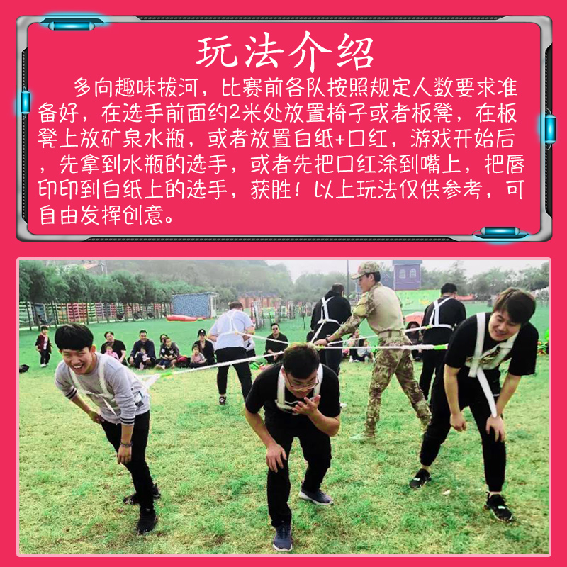 Two-person tug-of-war (2 straps + 2 ropes) Three-person tug-of-war (3 straps + 3 ropes + 1 steel ring) Four people tug-of-war (4 straps + 4 ropes + 1 steel ring) Five people tug-of-war (5 straps + 5 ropes + 1 steel ring) Six people Tug of war (6 straps + 6 ropes + 1 steel ring) Seven people Tug of war (7 straps + 7 ropes + 1 steel ring) Eight people Tug-of-war (8 straps + 8 ropes + 1 steel ring) Ten people tug-of-war (10 straps + 10 ropes + 1 steel ring)